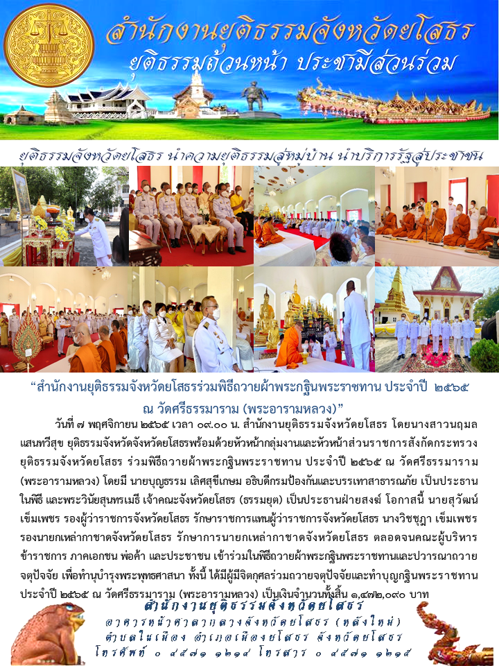 สำนักงานยุติธรรมจังหวัดยโสธรร่วมพิธีถวายผ้าพระกฐินพระราชทาน ประจำปี 2565 ณ วัดศรีธรรมาราม (พระอารามหลวง)