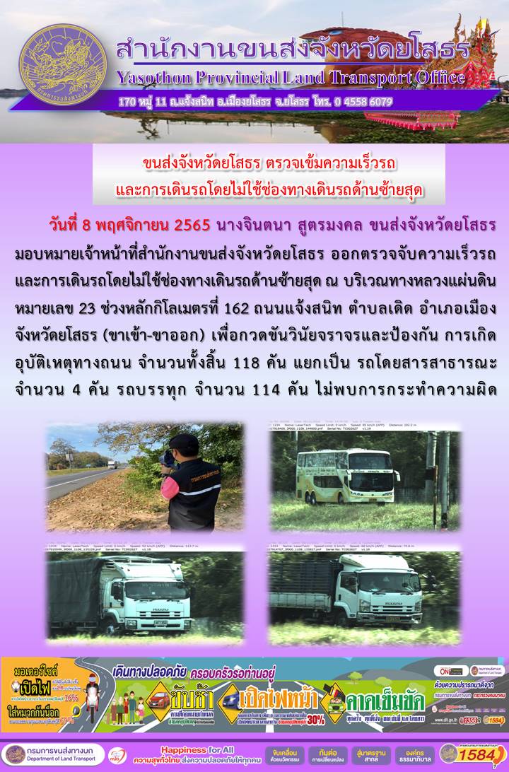 วันที่ 8 พฤศจิกายน 2565 เจ้าหน้าที่สำนักงานขนส่งจังหวัดยโสธร ออกตั้งจุดตรวจจับความเร็ว