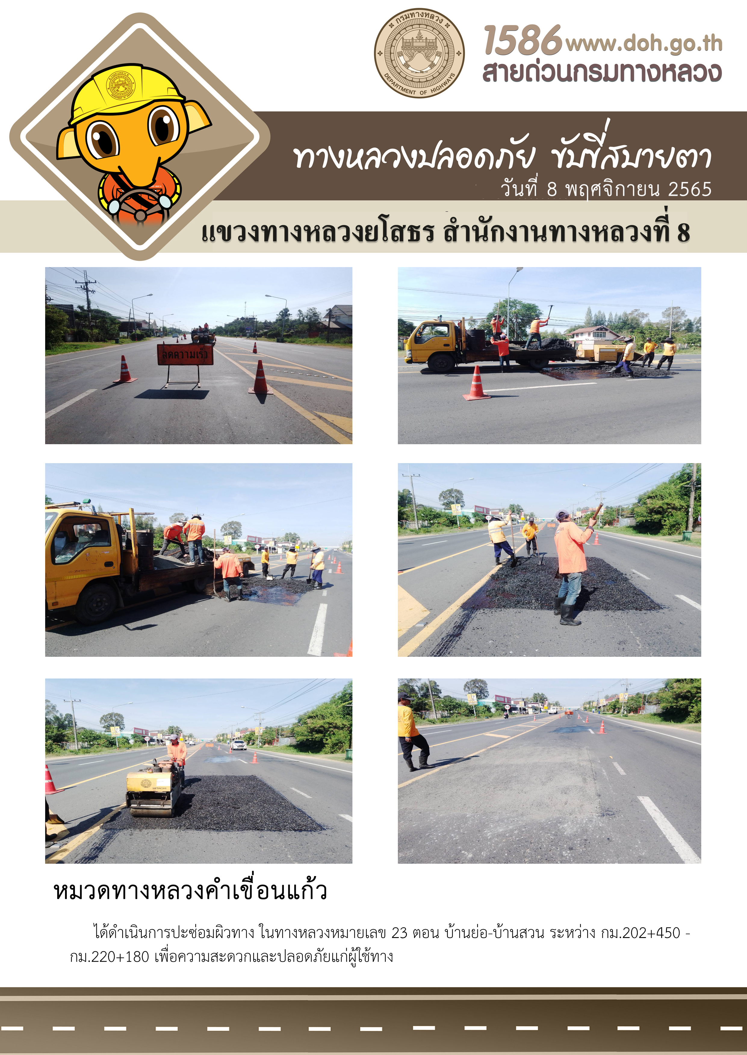 วันที่ 8 พฤศจิกายน 2565 หมวดทางหลวงคำเขื่อนแก้ว ได้ดำเนินการปะซ่อมผิวทาง ในทางหลวงหมายเลข 23 ตอน บ้านย่อ-บ้านสวน ระหว่าง กม.202+450 - กม.220+180 เพื่อความสะดวกและปลอดภัยแก่ผู้ใช้ทาง