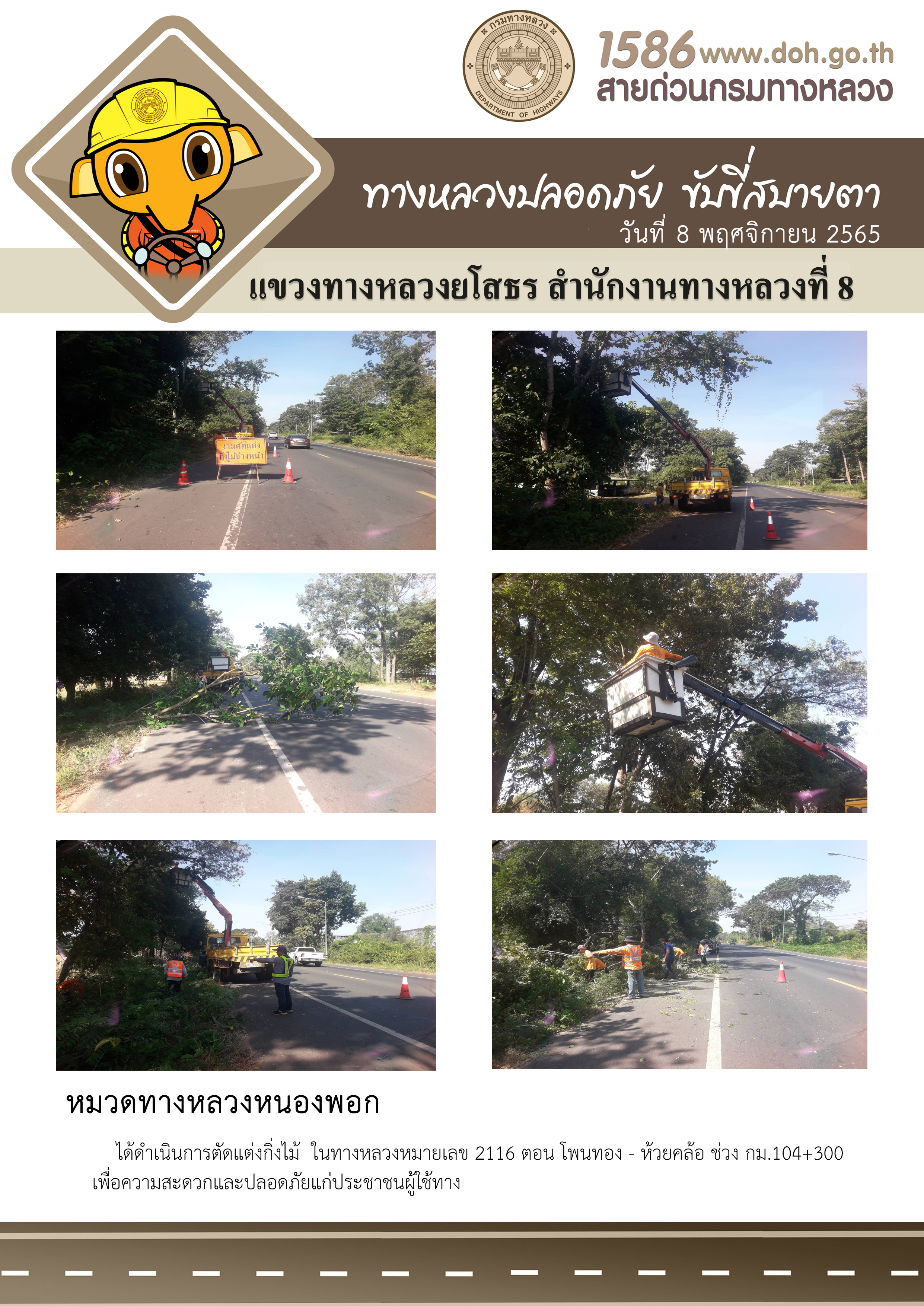 วันที่ 8 พฤศจิกายน 2565 หมวดทางหลวงหนองพอก ได้ดำเนินการตัดแต่งกิ่งไม้ ในทางหลวงหมายเลข 2116 ตอน โพนทอง - ห้วยคล้อ ช่วง กม.104+300 เพื่อความสะดวกและปลอดภัยแก่ประชาชนผู้ใช้ทาง