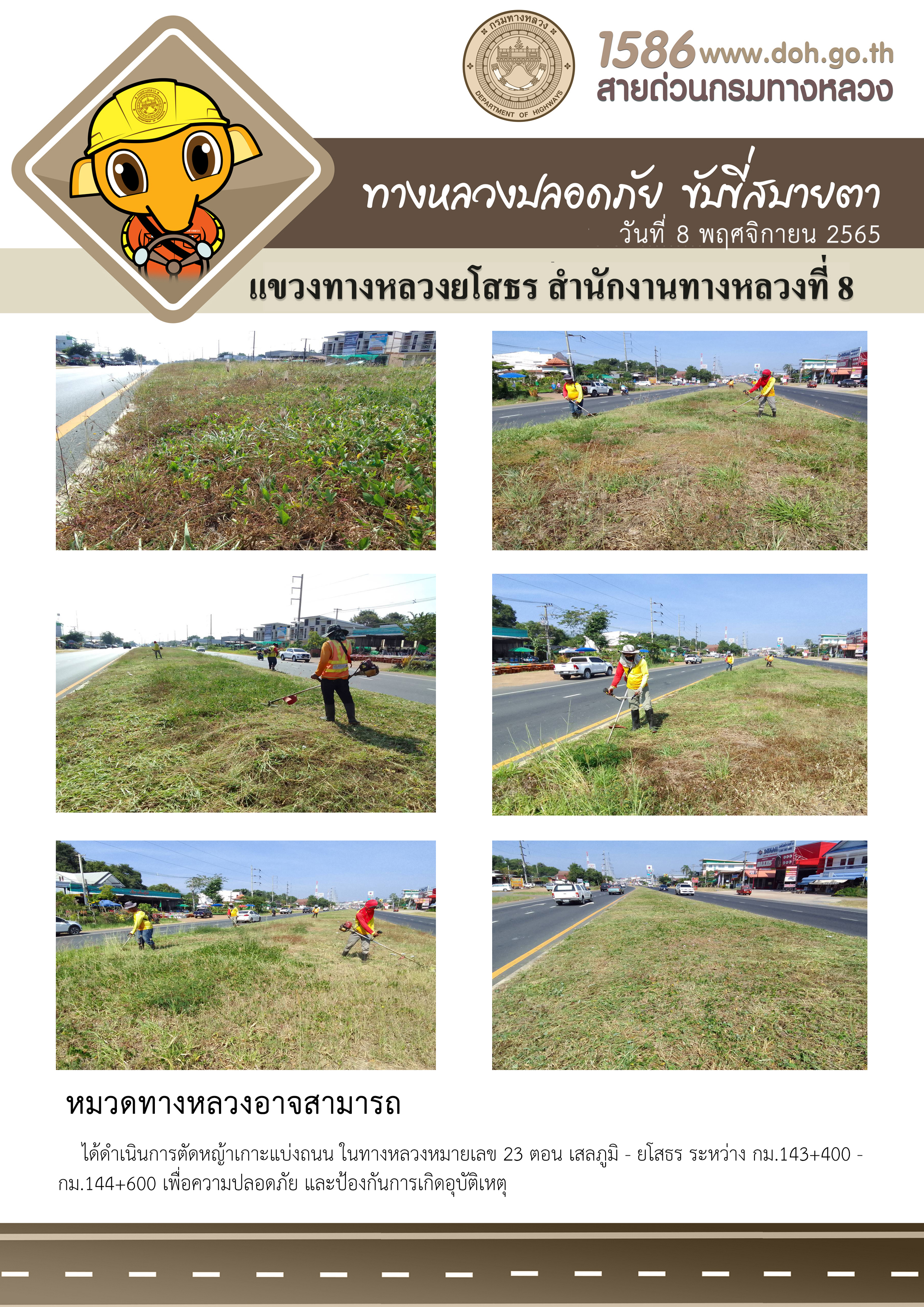วันที่ 8 พฤศจิกายน 2565 หมวดทางหลวงอาจสามารถ ได้ดำเนินการตัดหญ้าเกาะแบ่งถนน ในทางหลวงหมายเลข 23 ตอน เสลภูมิ - ยโสธร ระหว่าง กม.143+400 - กม. 144 +600 เพื่อความปลอดภัย และป้องกันการเกิดอุบัติเหตุ