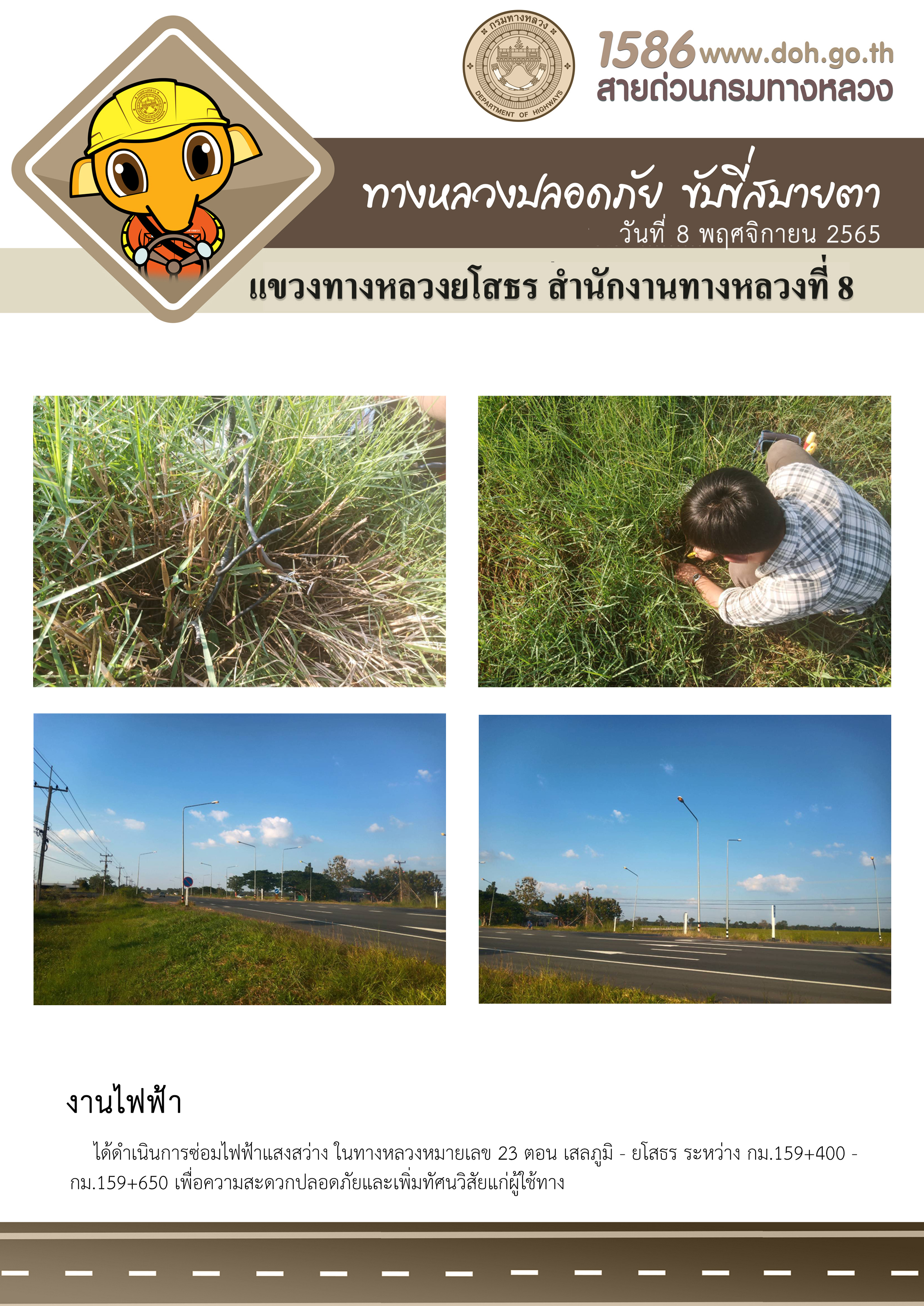 วันที่ 8 พฤศจิกายน 2565 งานไฟฟ้า ได้ดำเนินการซ่อมไฟฟ้าแสงสว่าง ในทางหลวงหมายเลข 23 ตอน เสลภูมิ - ยโสธร ระหว่าง กม.159+400 - กม.159+650 เพื่อความสะดวกปลอดภัยและเพิ่มทัศนวิสัยแก่ผู้ใช้ทาง