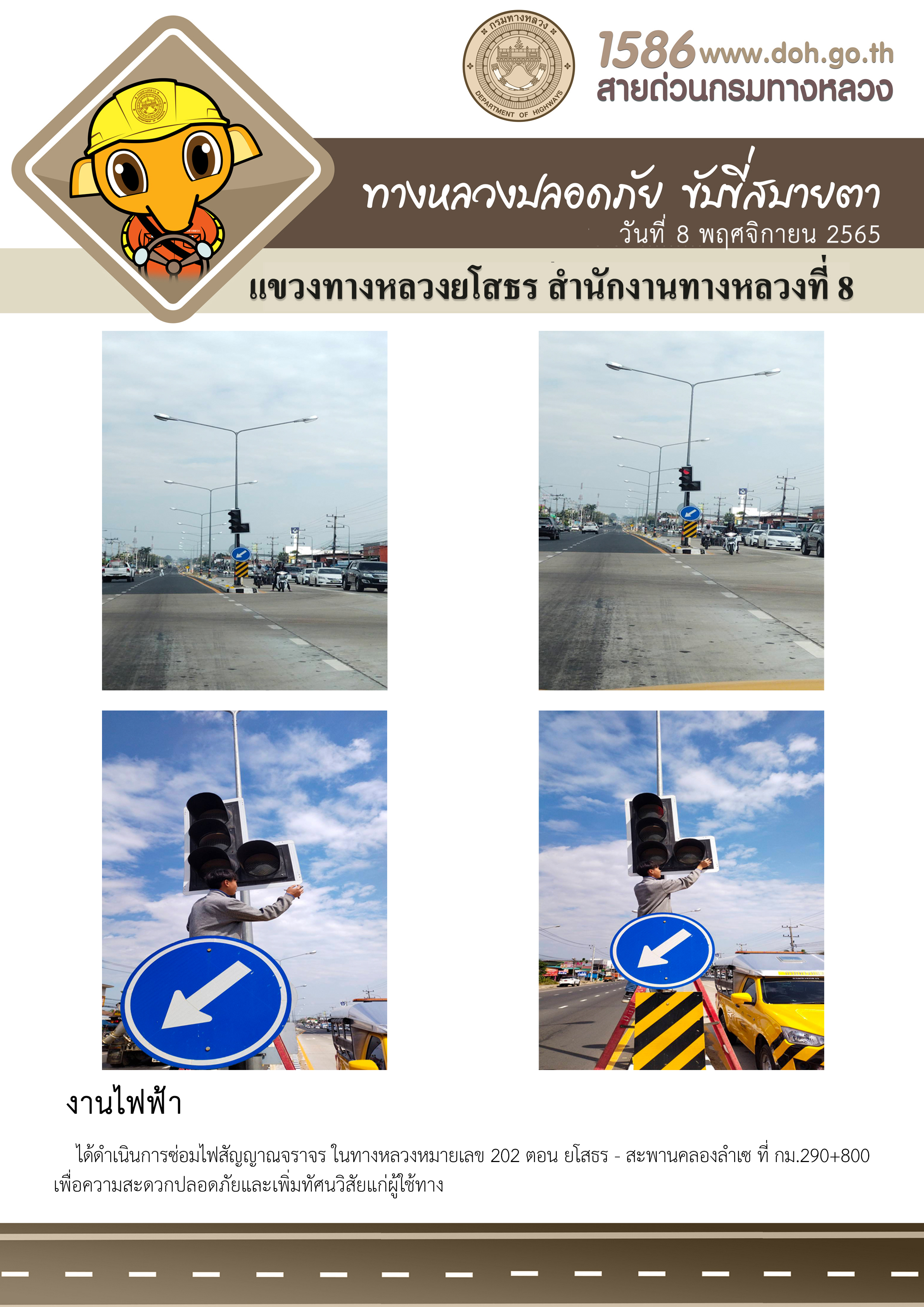 วันที่ 8 พฤศจิกายน 2565 งานไฟฟ้า ได้ดำเนินการซ่อมไฟสัญญาณจราจร ในทางหลวงหมายเลข 202 ตอน ยโสธร - สะพานคลองลำเซ ที่ กม.290+800 เพื่อความสะดวกปลอดภัยและเพิ่มทัศนวิสัยแก่ผู้ใช้ทาง