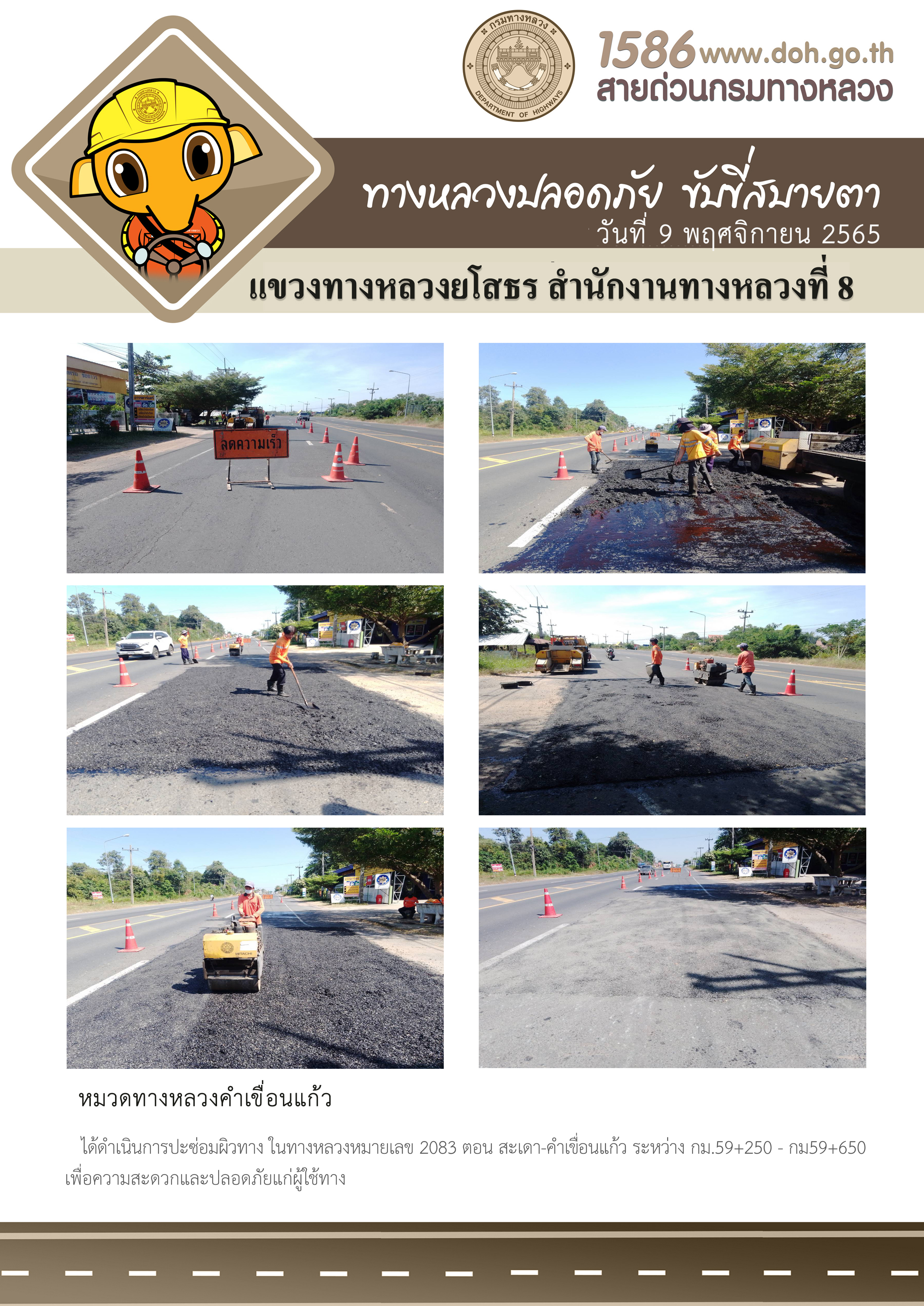 วันที่ 9 พฤศจิกายน 2565 หมวดทางหลวงคำเขื่อนแก้ว ได้ดำเนินการปะซ่อมผิวทาง ในทางหลวงหมายเลข 2083 ตอน สะเดา-คำเขื่อนแก้ว ระหว่าง กม.59+250 - กม59+650 เพื่อความสะดวกและปลอดภัยแก่ผู้ใช้ทาง