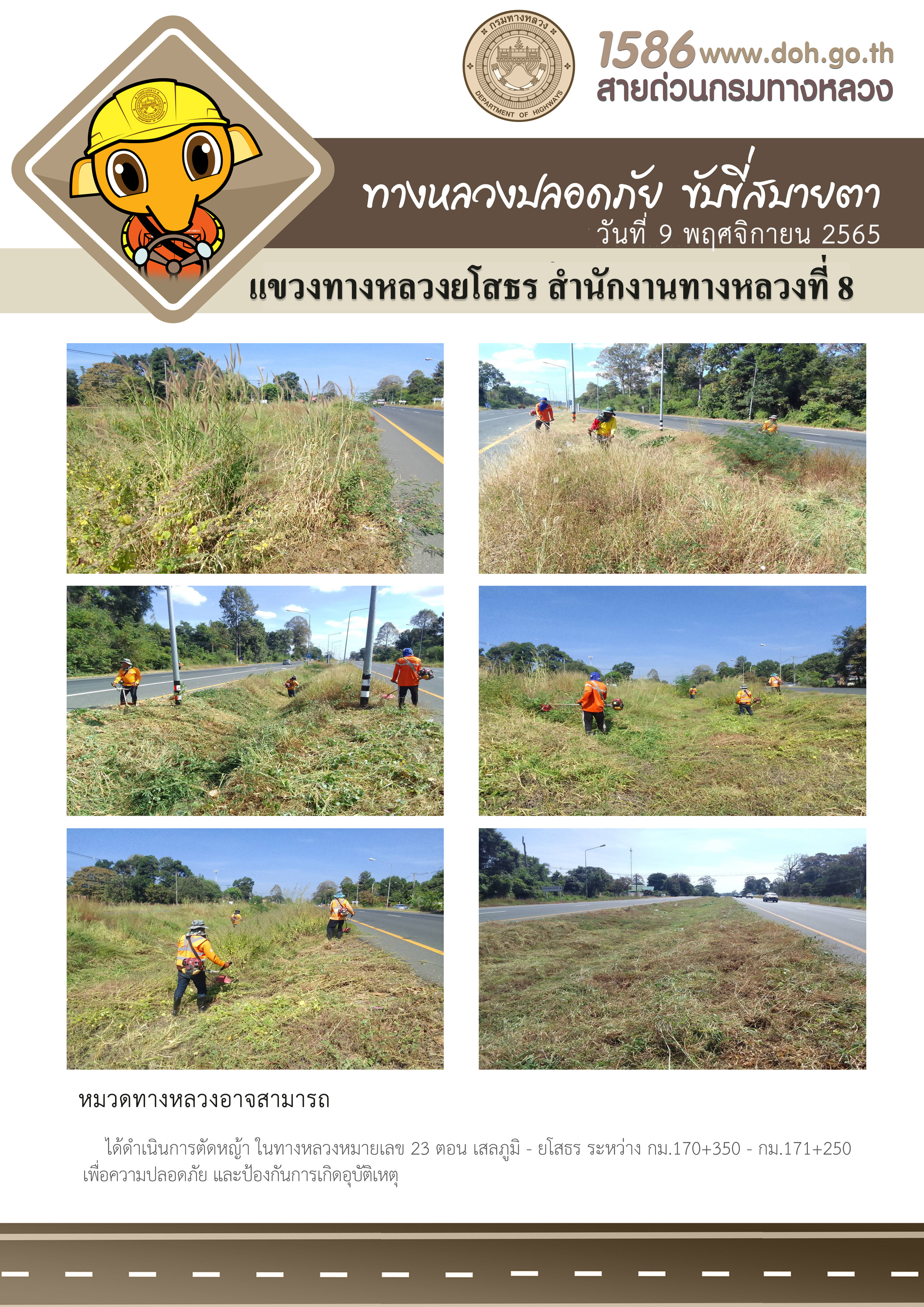 วันที่ 9 พฤศจิกายน 2565 หมวดทางหลวงอาจสามารถ ได้ดำเนินการตัดหญ้า ในทางหลวงหมายเลข 23 ตอน เสลภูมิ - ยโสธร ระหว่าง กม.170+350 - กม.171+250 เพื่อความปลอดภัย และป้องกันการเกิดอุบัติเหตุ
