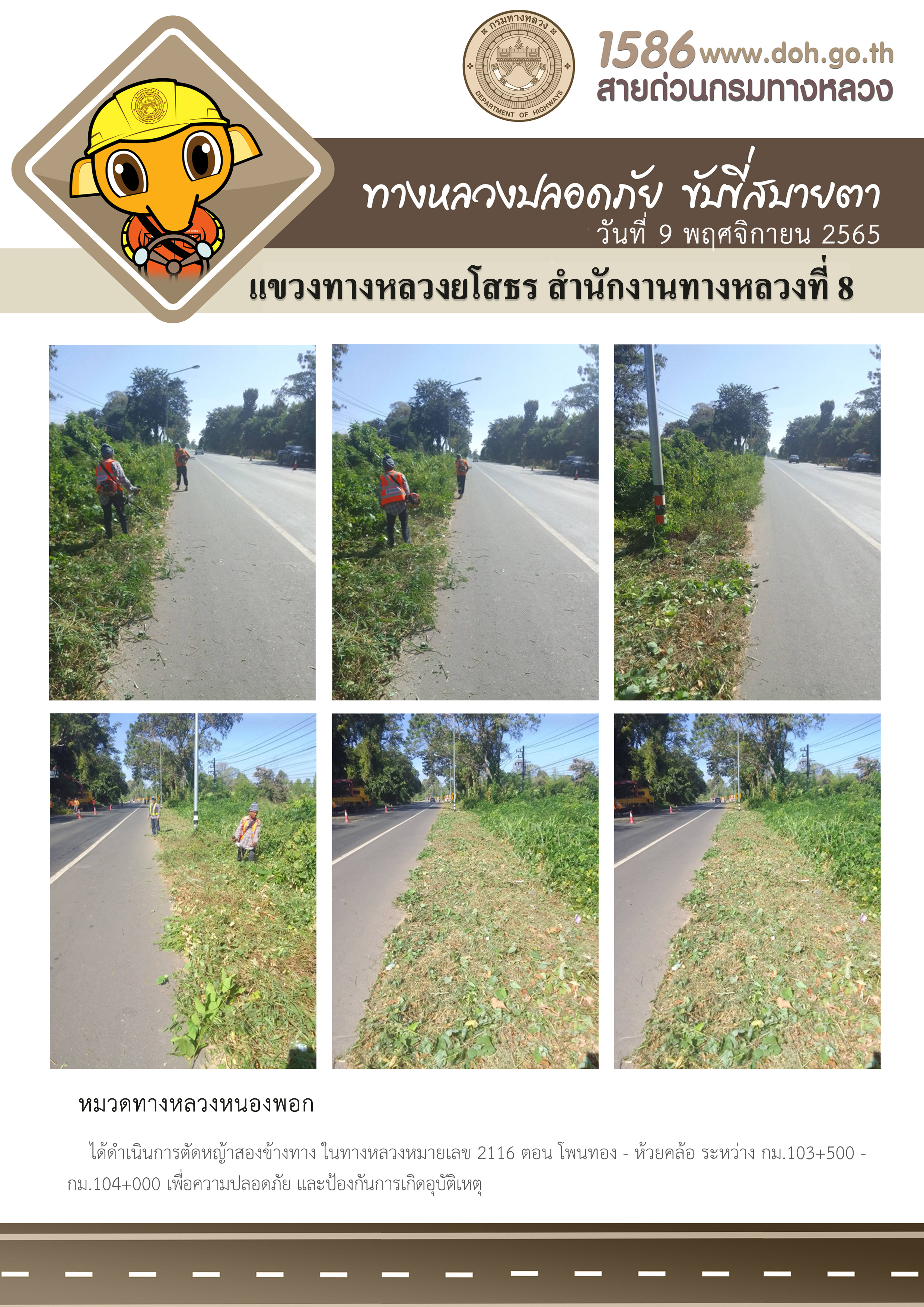วันที่ 9 พฤศจิกายน 2565 หมวดทางหลวงหนองพอก ได้ดำเนินการตัดหญ้าสองข้างทาง ในทางหลวงหมายเลข 2116 ตอน โพนทอง - ห้วยคล้อ ระหว่าง กม.103+500 - กม.104+000 เพื่อความปลอดภัย และป้องกันการเกิดอุบัติเหตุ