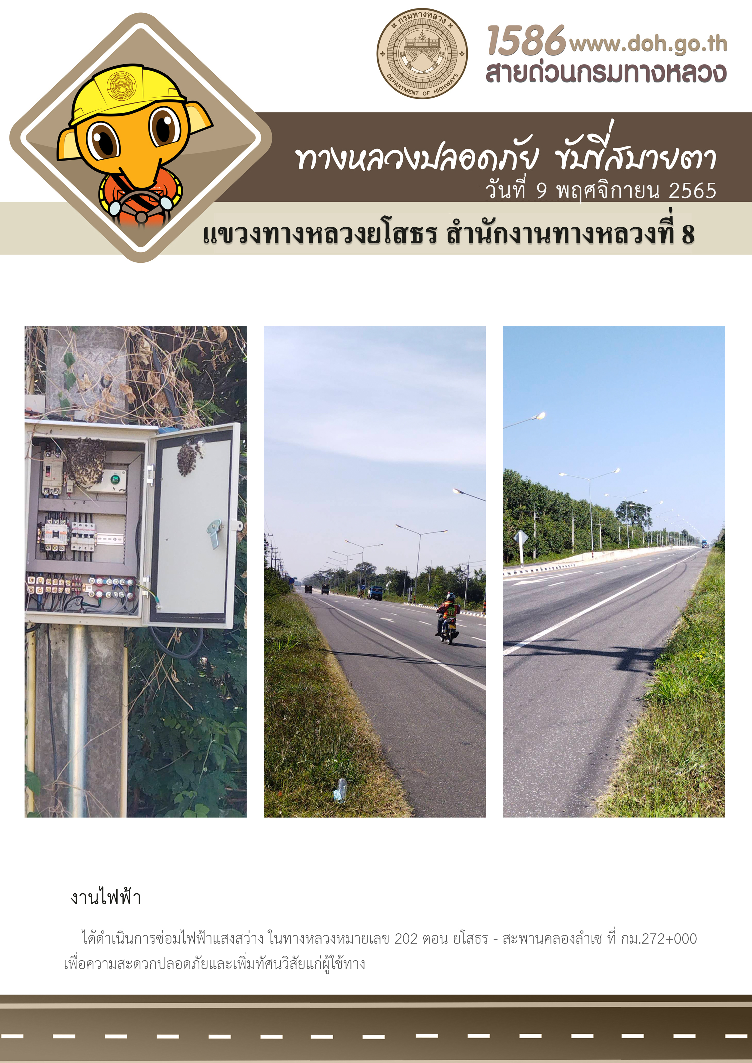วันที่ 9 พฤศจิกายน 2565 งานไฟฟ้า ได้ดำเนินการซ่อมไฟฟ้าแสงสว่าง ในทางหลวงหมายเลข 202 ตอน ยโสธร - สะพานคลองลำเซ ที่ กม.272+000 เพื่อความสะดวกปลอดภัยและเพิ่มทัศนวิสัยแก่ผู้ใช้ทาง