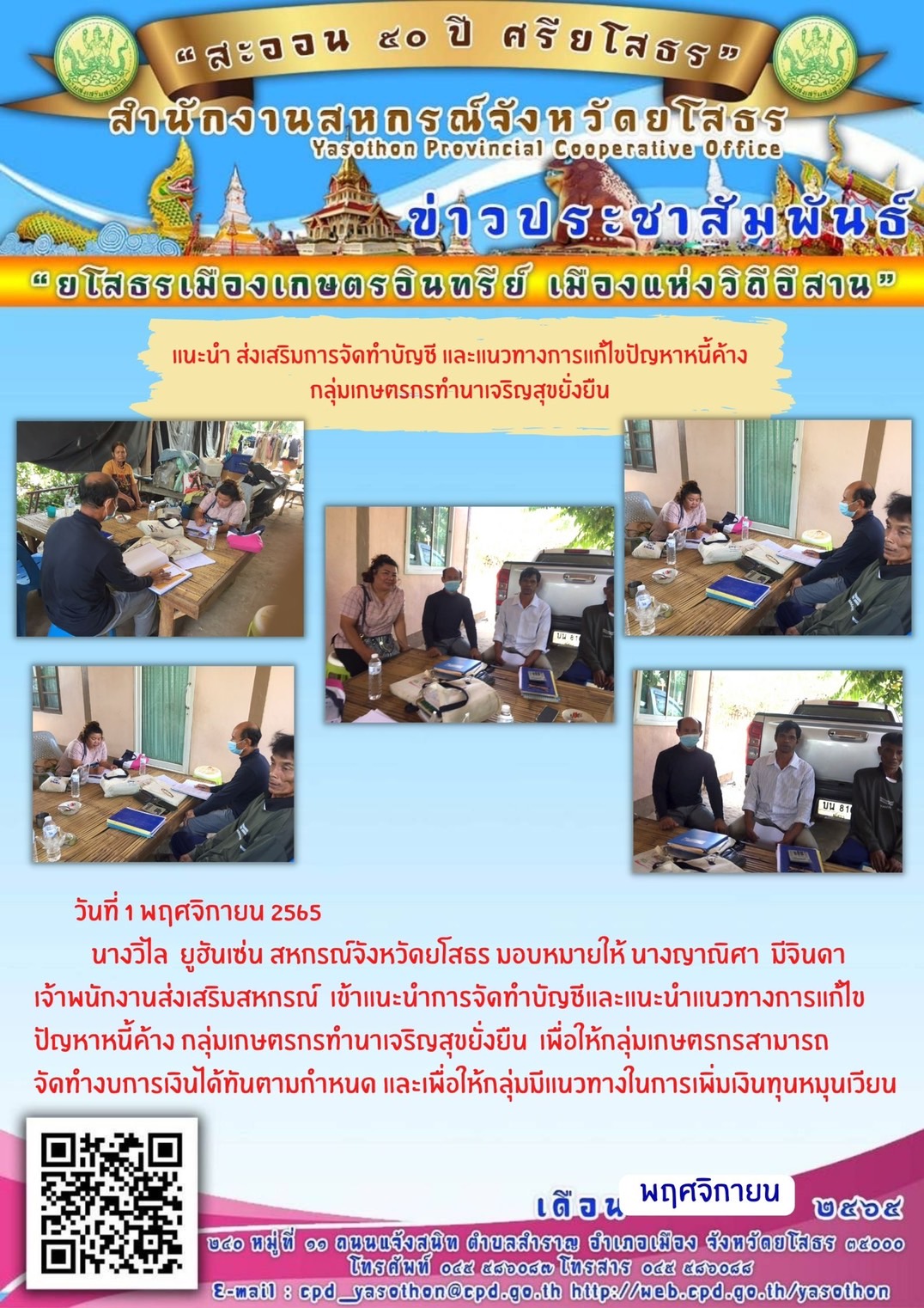 เจ้าหน้าที่สำนักงานสหกรณ์จังหวัดยโสธร เข้าแนะนำการจัดทำบัญชีและแนะนำแนวทางการแก้ไขปัญหาหนี้ค้าง กลุ่มเกษตรกรทำนาเจริญสุขยั่งยืน เพื่อให้กลุ่มเกษตรกรสามารถจัดทำงบการเงินได้ทันตามกำหนด และเพื่อให้กลุ่มมีแนวทางในการเพิ่มเงินทุนหมุนเวียน