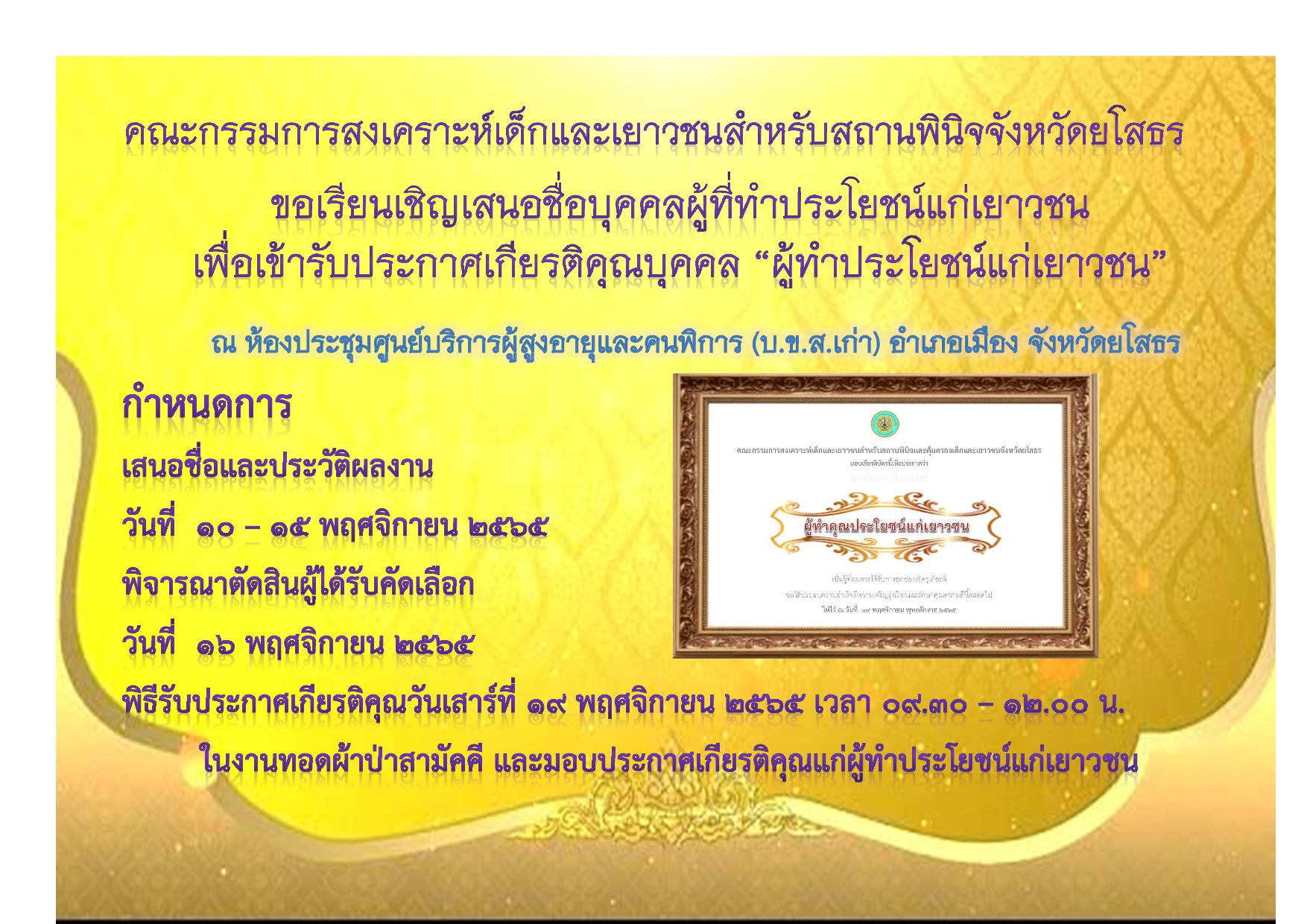 คณะกรรมการสงเคราะห์เด็กและเยาวชนสำหรับสถานพินิจจังหวัดยโสธร ขอเชิญ ส่งรายชื่อบุคคล ผู้ทำประโยชน์แก่เยาวชนเพื่อรับประกาศเกียรติคุณรางวัล "ผู้ทำประโยชน์แก่เยาวชน"