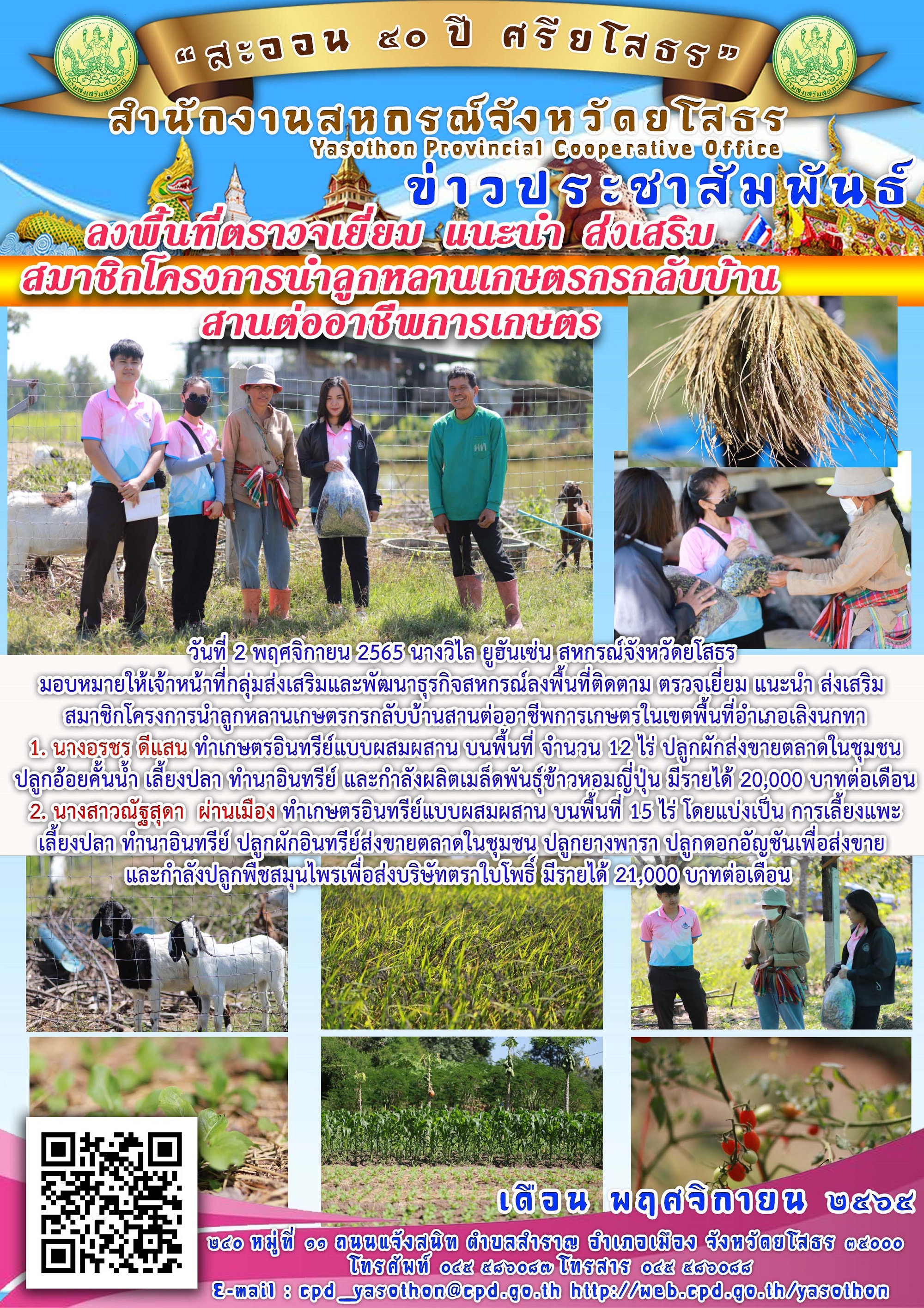 เจ้าหน้าที่สำนักงานสหกรณ์จังหวัดยโสธร ลงพื้นที่ติดตาม ตรวจเยี่ยม แนะนำส่งเสริมสมาชิกโครงการนำลูกหลานกลับบ้านสานต่ออาชีพการเกษตรในเขตพื้นที่อำเภอเลิงนกทา จำนวน 2 ท่าน ในเขตพื้นที่อำเภอเลิงนกทา