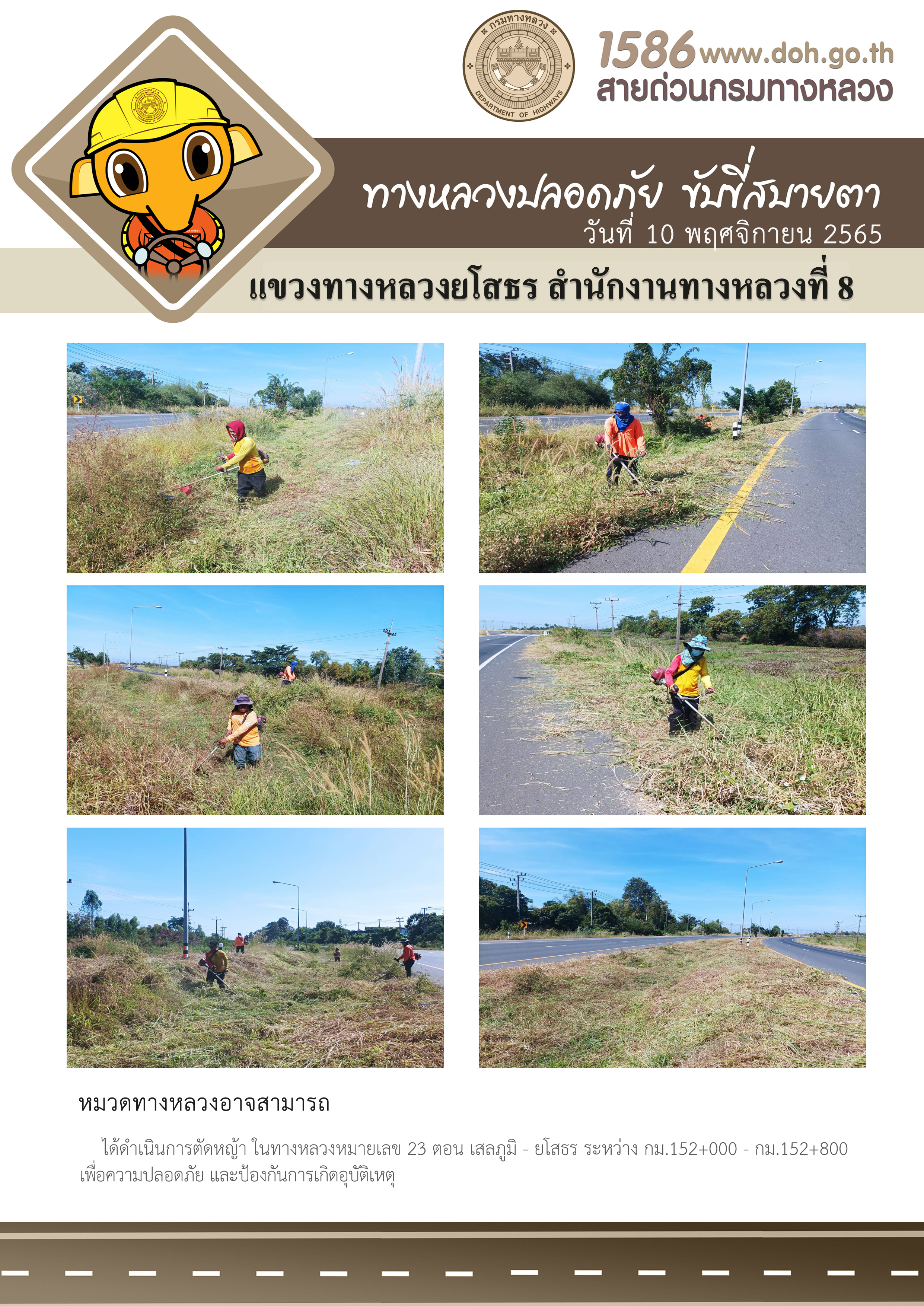วันที่ 10 พฤศจิกายน 2565 หมวดทางหลวงอาจสามารถ ได้ดำเนินการตัดหญ้า ในทางหลวงหมายเลข 23 ตอน เสลภูมิ - ยโสธร ระหว่าง กม.152+000 - กม.152+800 เพื่อความปลอดภัย และป้องกันการเกิดอุบัติเหตุ