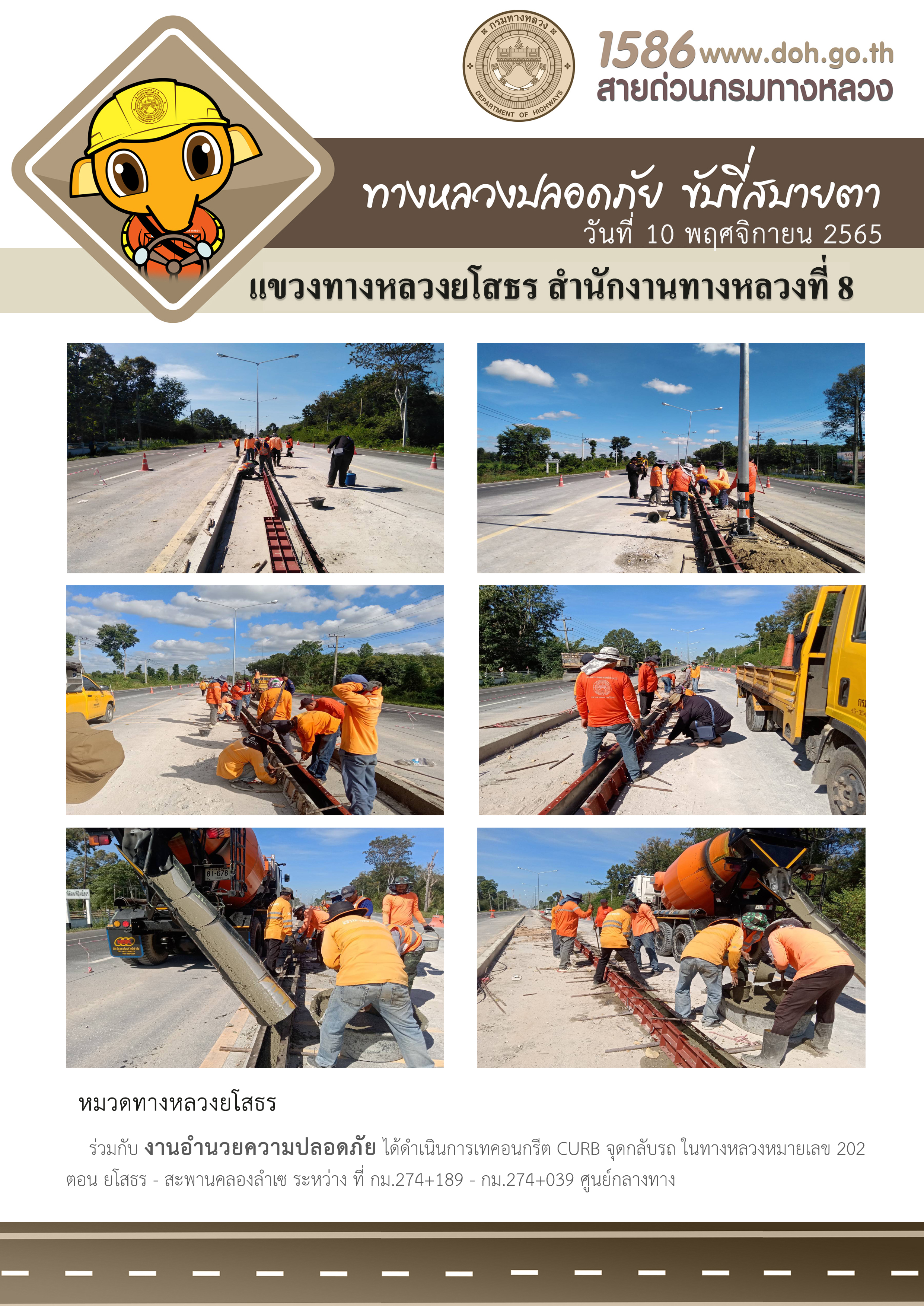 วันที่ 10 พฤศจิกายน 2565 หมวดทางหลวงยโสธร ร่วมกับ งานอำนวยความปลอดภัย ได้ดำเนินการเทคอนกรีต CURB จุดกลับรถ ในทางหลวงหมายเลข 202 ตอน ยโสธร - สะพานคลองลำเซ ระหว่าง ที่ กม.274+189 - กม.274+039 ศูนย์กลางทาง
