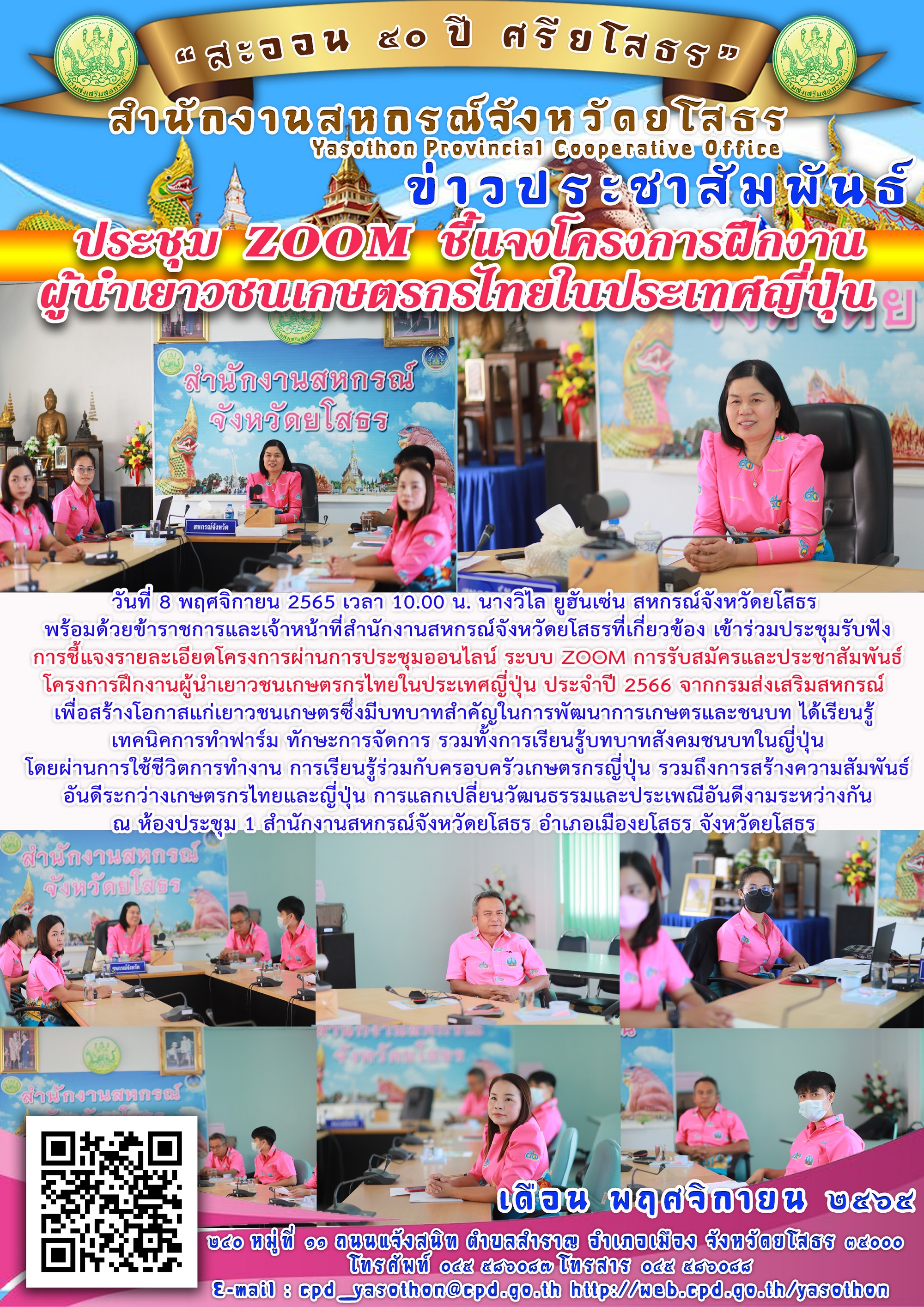 นางวิไล ยูฮันเซ่น สหกรณ์จังหวัดยโสธร พร้อมด้วยข้าราชการและเจ้าหน้าที่สำนักงานสหกรณ์จังหวัดยโสธร เข้าร่วมประชุมรับฟังการชี้แจงรายละเอียดโครงการผ่านการประชุมออนไลน์ ระบบ Zoom การรับสมัครและประชาสัมพันธ์โครงการฝึกงานผู้นำเยาวชนเกษตรกรไทยในประเทศญี่ปุ่น
