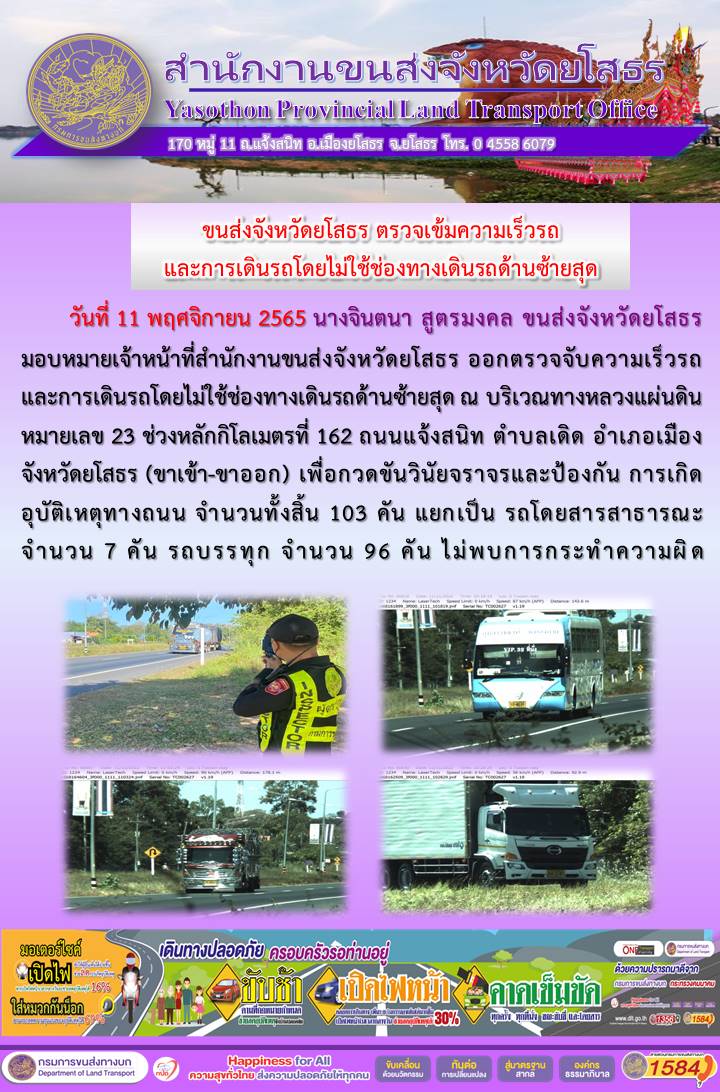 วันที่ 11 พฤศจิกายน 2565 เจ้าหน้าที่สำนักงานขนส่งจังหวัดยโสธร ออกตั้งจุดตรวจจับความเร็ว
