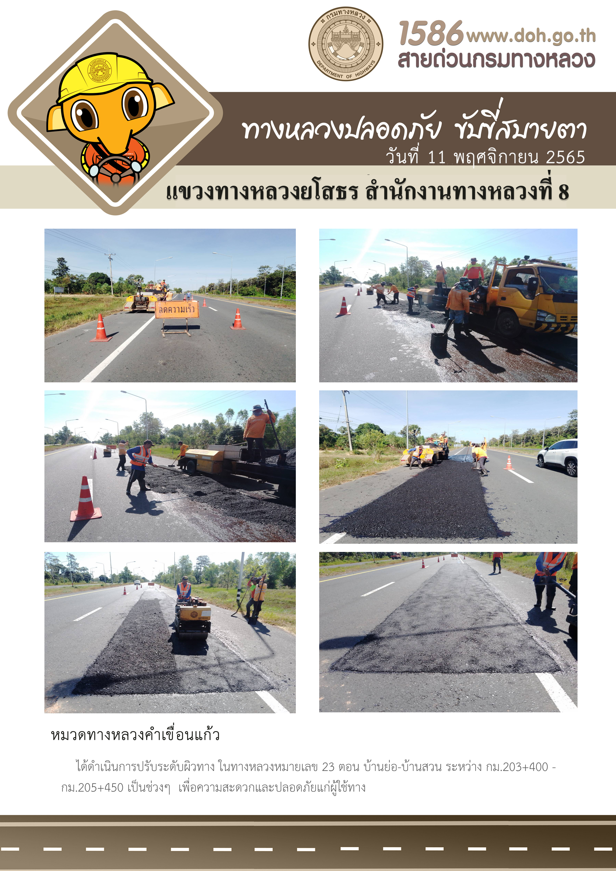 วันที่ 11 พฤศจิกายน 2565 หมวดทางหลวงคำเขื่อนแก้ว ได้ดำเนินการปรับระดับผิวทาง ในทางหลวงหมายเลข 23 ตอน บ้านย่อ-บ้านสวน ระหว่าง กม.203+400 - กม.205+450 เป็นช่วงๆ เพื่อความสะดวกและปลอดภัยแก่ผู้ใช้ทาง