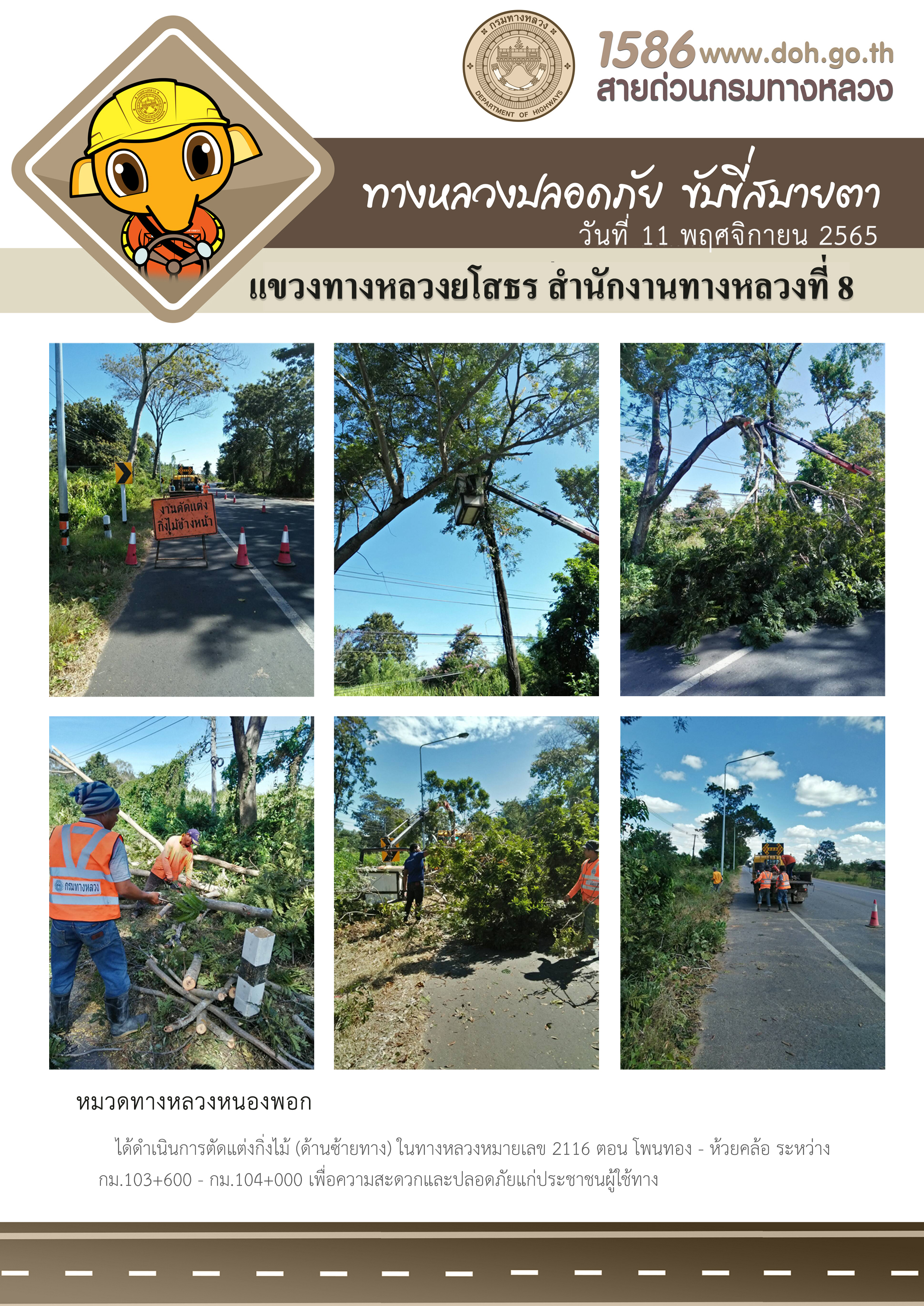 วันที่ 11 พฤศจิกายน 2565 หมวดทางหลวงหนองพอก ได้ดำเนินการตัดแต่งกิ่งไม้ (ด้านซ้ายทาง) ในทางหลวงหมายเลข 2116 ตอน โพนทอง - ห้วยคล้อ ระหว่าง กม.103+600 - กม.104+000 เพื่อความสะดวกและปลอดภัยแก่ประชาชนผู้ใช้ทาง