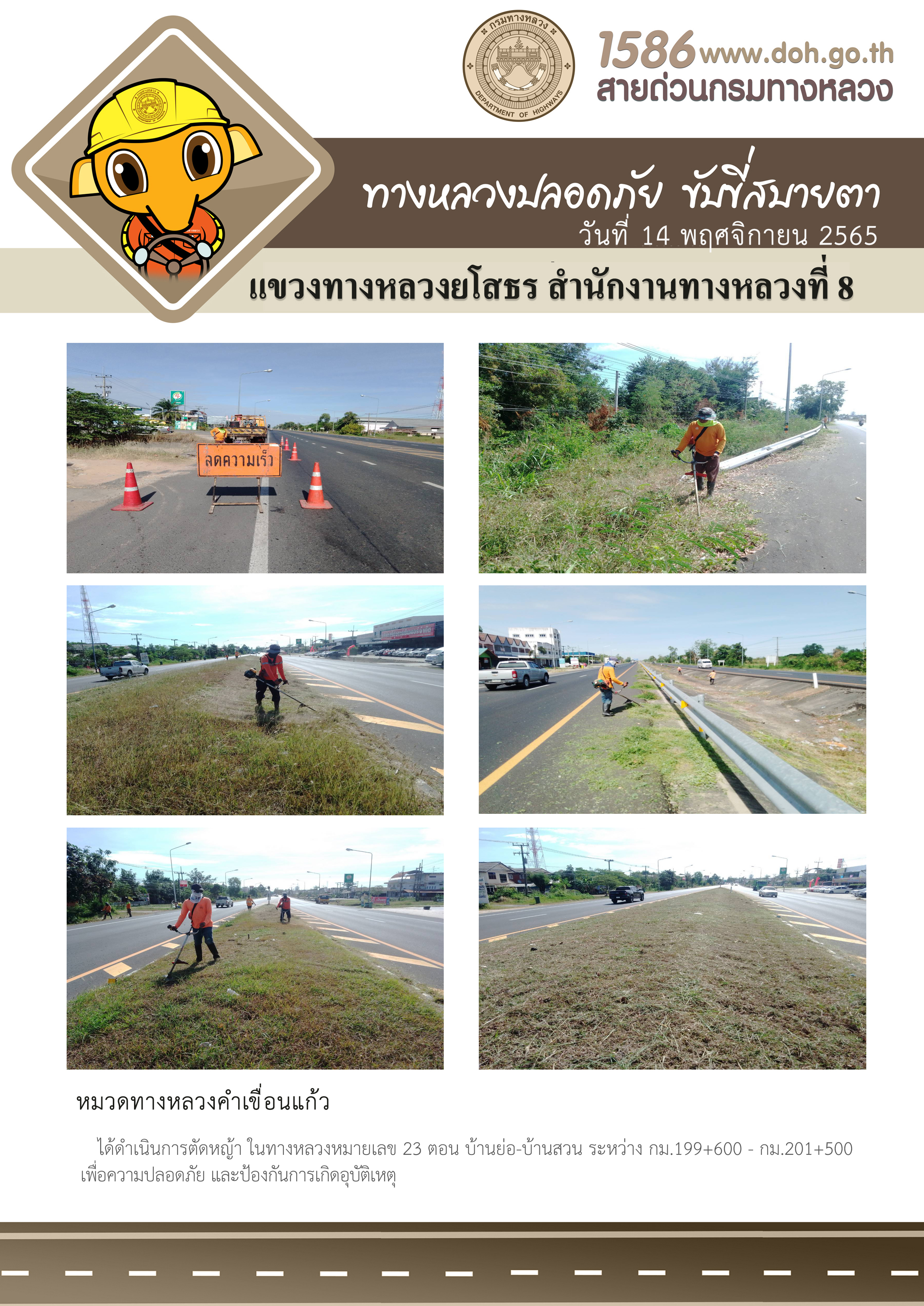 วันที่ 14 พฤศจิกายน 2565 หมวดทางหลวงคำเขื่อนแก้ว ได้ดำเนินการตัดหญ้า ในทางหลวงหมายเลข 23 ตอน บ้านย่อ-บ้านสวน ระหว่าง กม.199+600 - กม.201+500 เพื่อความปลอดภัย และป้องกันการเกิดอุบัติเหตุ