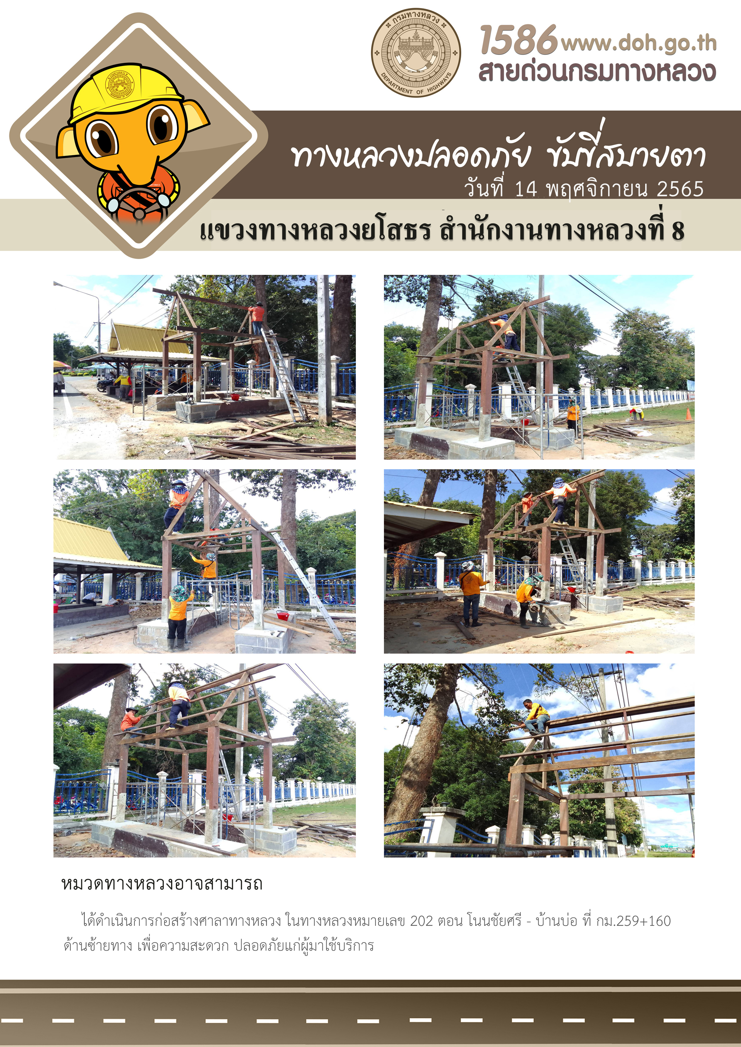 - [15:24] ทั่วไป วันจันทร์ที่ 20 เมษายน 2569 หมวดทางหลวงยโสธร ได้ดำเนินการถอดแบบพร้อมติดตั้งแบบเกาะกลางถนน ในทางหลวงหมายเลข 2169 ตอน ยโสธร - กุดชุม ระหว่าง กม.3+000 - กม.3+400 เพื่อความสะดวกปลอดภัย และเพิ่มทัศนวิสัยแก่ผู้ใช้ทาง