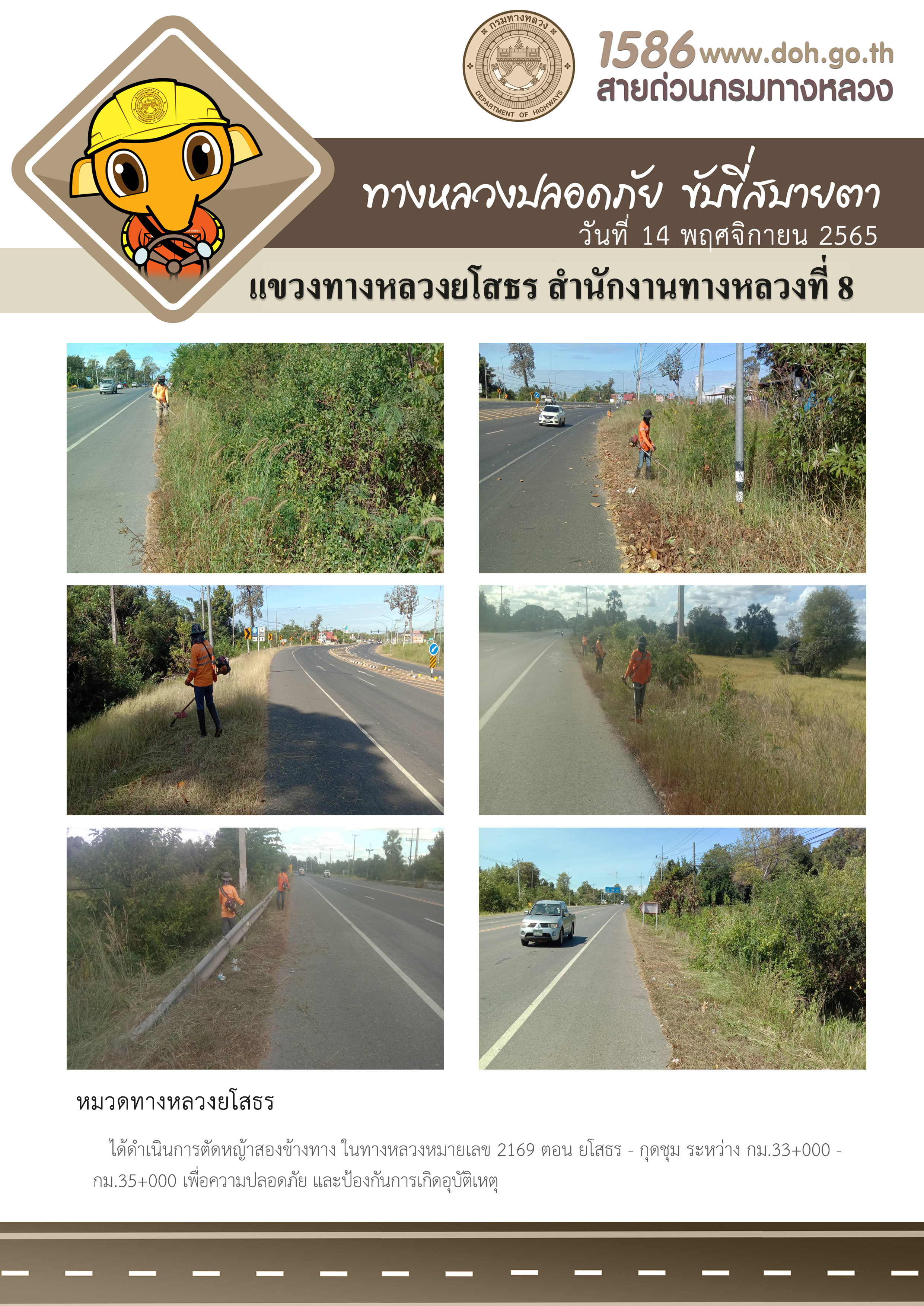 วันที่ 14 พฤศจิกายน 2565 หมวดทางหลวงยโสธร ได้ดำเนินการตัดหญ้าสองข้างทาง ในทางหลวงหมายเลข 2169 ตอน ยโสธร - กุดชุม ระหว่าง กม.33+000 - กม.35+000 เพื่อความปลอดภัย และป้องกันการเกิดอุบัติเหตุ