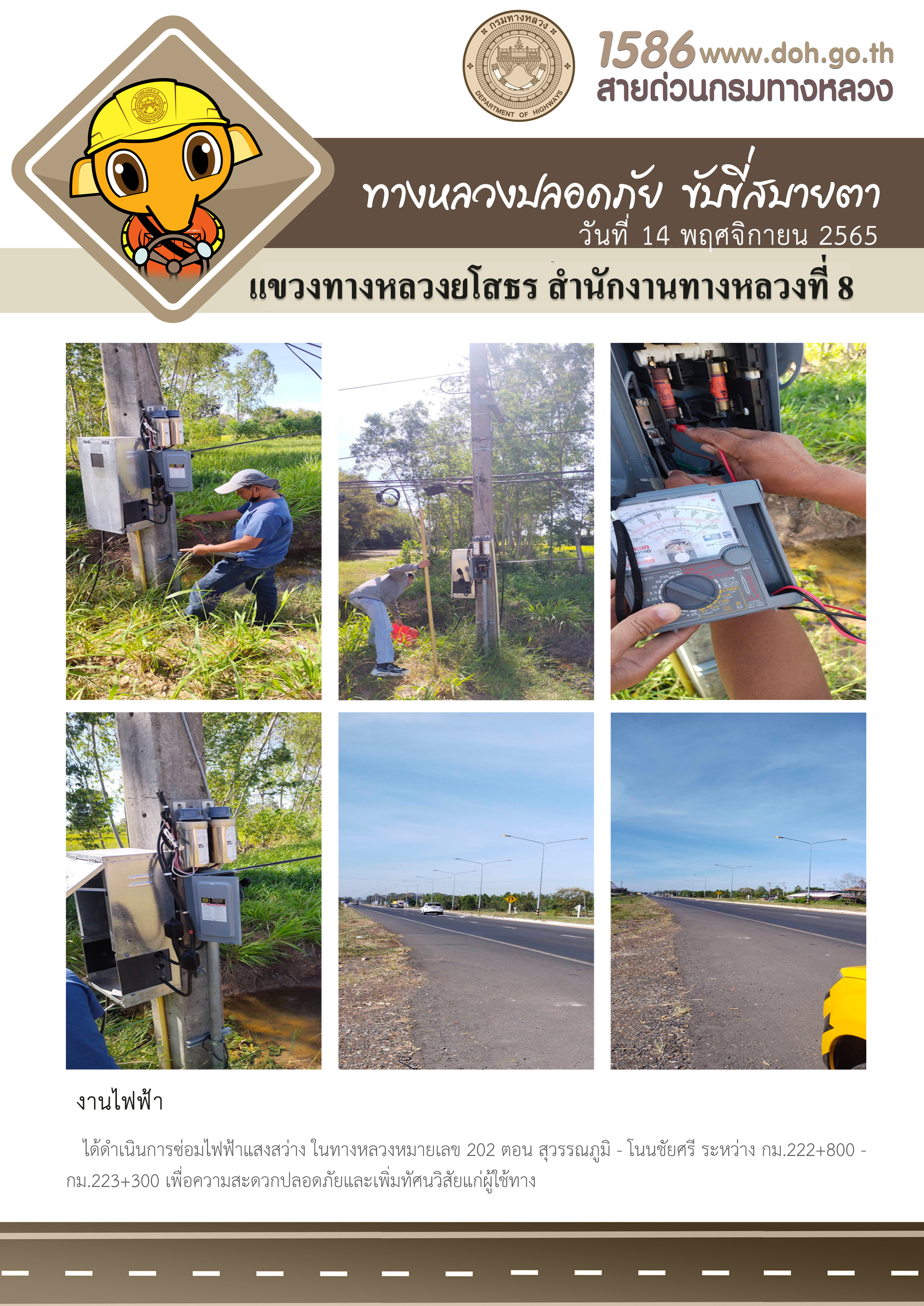 - [15:28] ทั่วไป วันจันทร์ที่ 20 เมษายน 2569 งานไฟฟ้า ได้ดำเนินการซ่อมไฟฟ้าแสงสว่าง ในทางหลวงหมายเลข 292 ตอน ทางเลี่ยงเมืองยโสธร ที่ กม.7+000 เพื่อความสะดวกปลอดภัย และเพิ่มทัศนวิสัยแก่ผู้ใช้ทาง