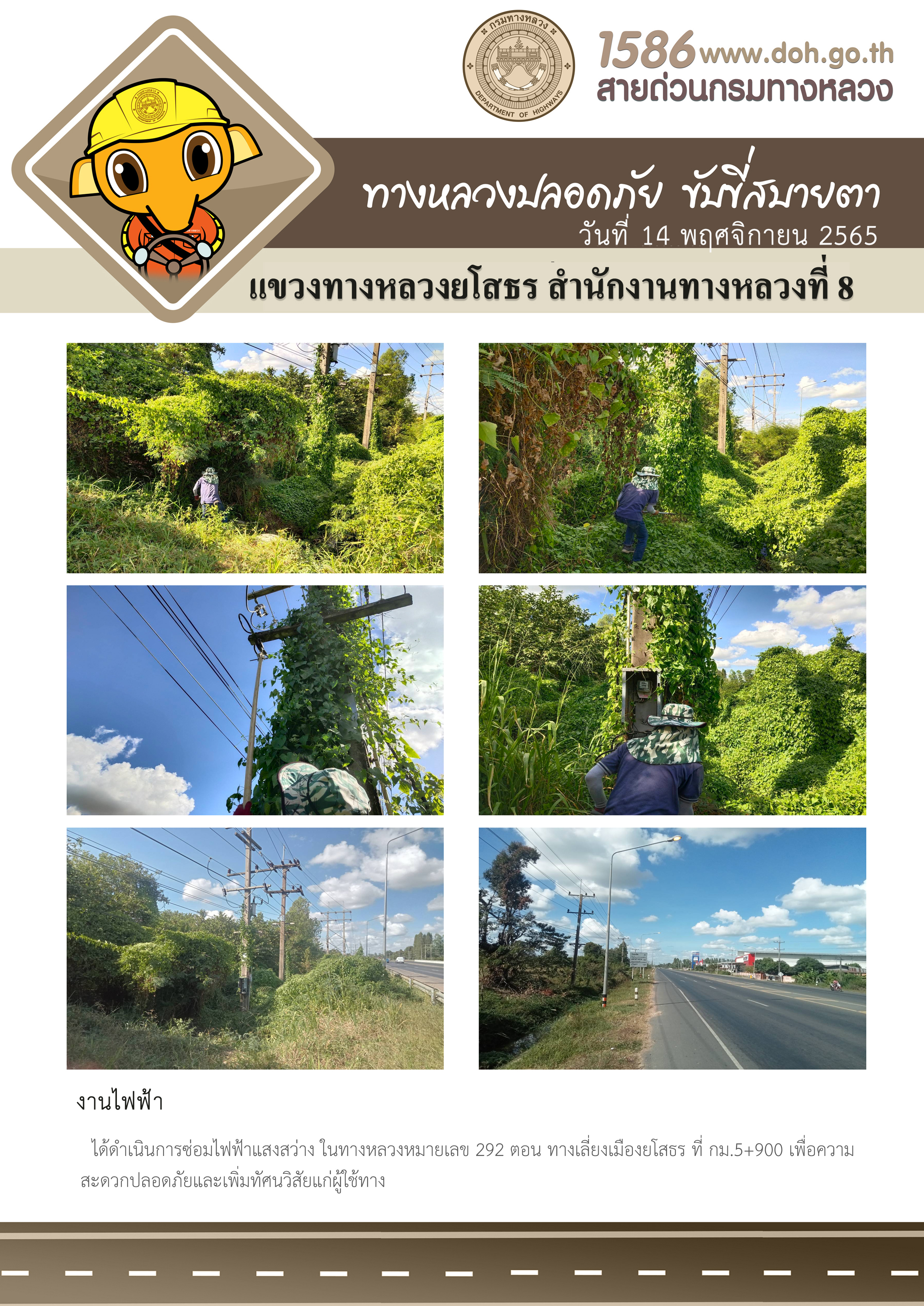 วันที่ 14 พฤศจิกายน 2565 งานไฟฟ้า ได้ดำเนินการซ่อมไฟฟ้าแสงสว่าง ในทางหลวงหมายเลข 292 ตอน ทางเลี่ยงเมืองยโสธร ที่ กม.5+900 เพื่อความสะดวกปลอดภัยและเพิ่มทัศนวิสัยแก่ผู้ใช้ทาง