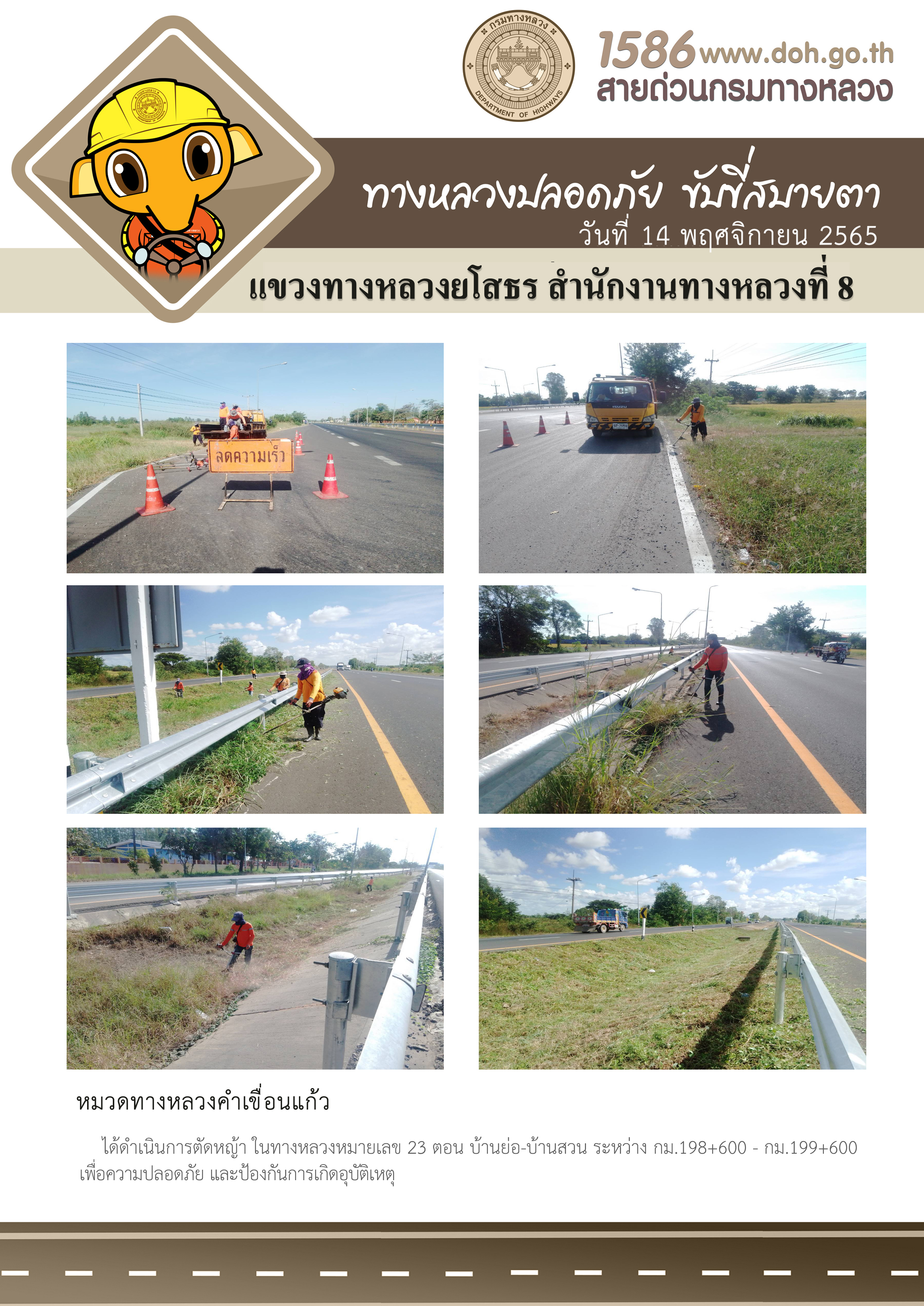 วันที่ 15 พฤศจิกายน 2565 หมวดทางหลวงคำเขื่อนแก้ว ได้ดำเนินการตัดหญ้า ในทางหลวงหมายเลข 23 ตอน บ้านย่อ-บ้านสวน ระหว่าง กม.198+600 - กม.199+600 เพื่อความปลอดภัย และป้องกันการเกิดอุบัติเหตุ