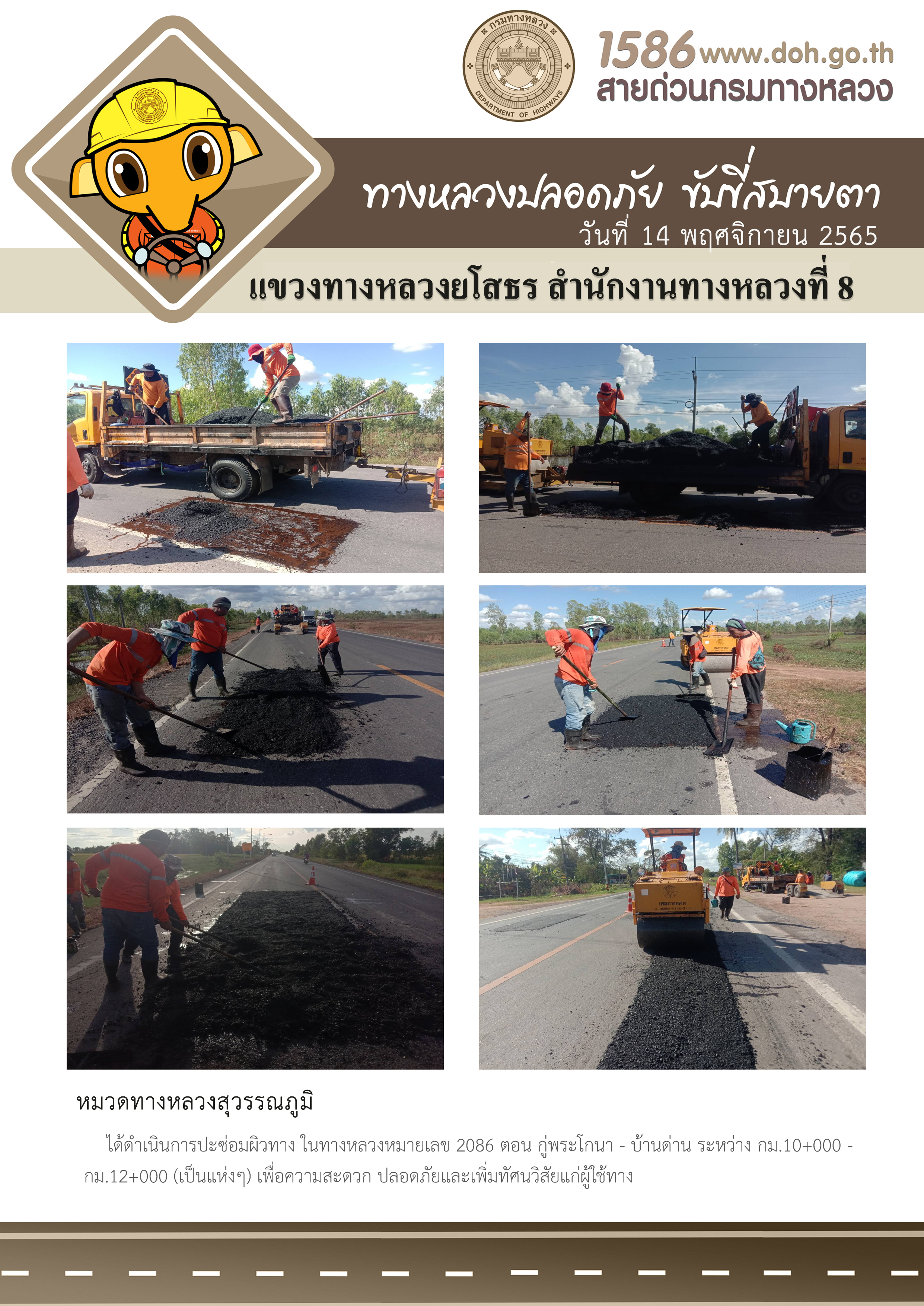 วันที่ 15 พฤศจิกายน 2565 หมวดทางหลวงสุวรรณภูมิ ได้ดำเนินการปะซ่อมผิวทาง ในทางหลวงหมายเลข 2086 ตอน กู่พระโกนา - บ้านด่าน ระหว่าง กม.10+000 - กม.12+000 (เป็นแห่งๆ) เพื่อความสะดวก ปลอดภัยและเพิ่มทัศนวิสัยแก่ผู้ใช้ทาง