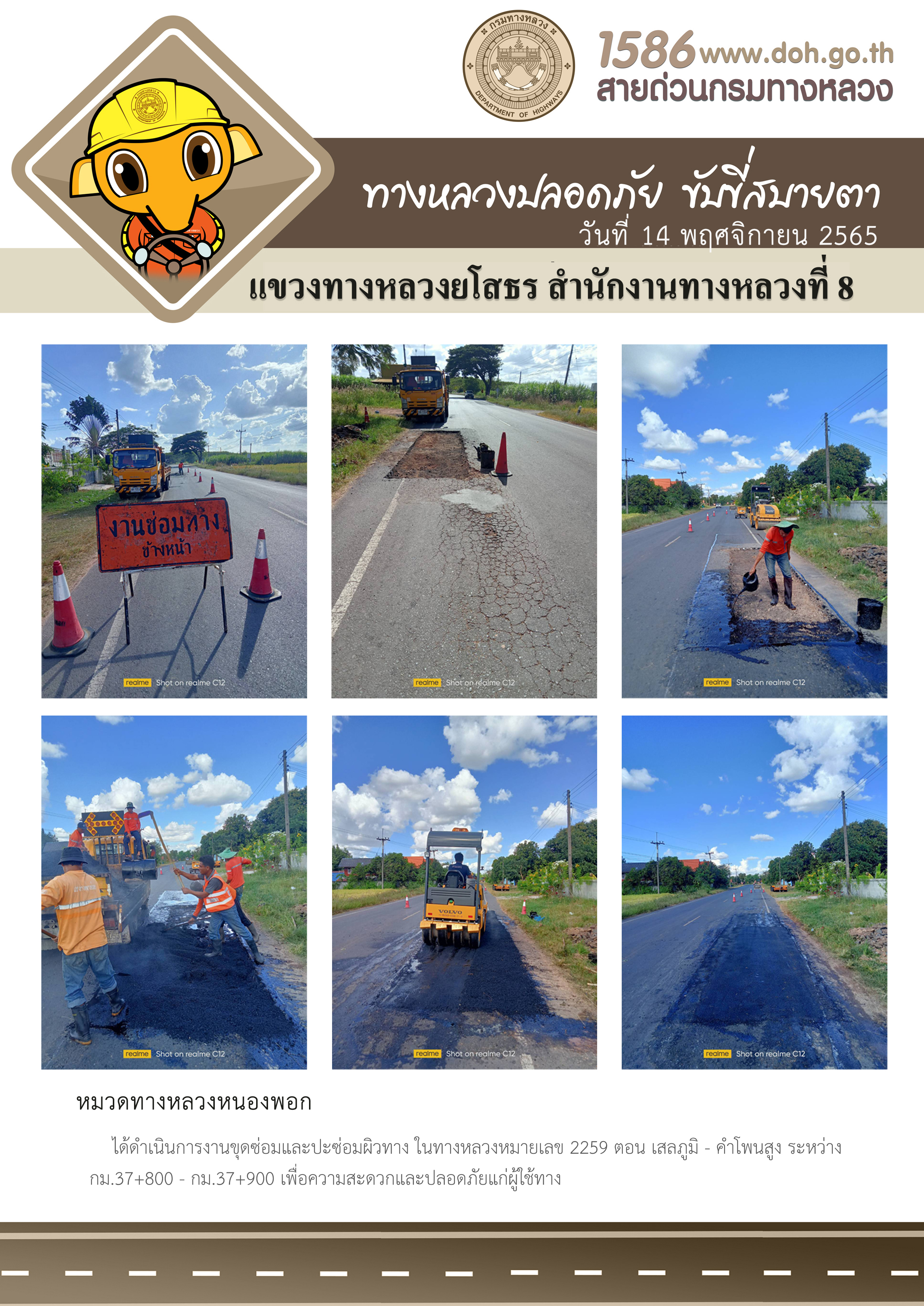 วันที่ 15 พฤศจิกายน 2565 หมวดทางหลวงหนองพอก ได้ดำเนินการงานขุดซ่อมและปะซ่อมผิวทาง ในทางหลวงหมายเลข 2259 ตอน เสลภูมิ - คำโพนสูง ระหว่าง กม.37+800 - กม.37+900 เพื่อความสะดวกและปลอดภัยแก่ผู้ใช้ทาง