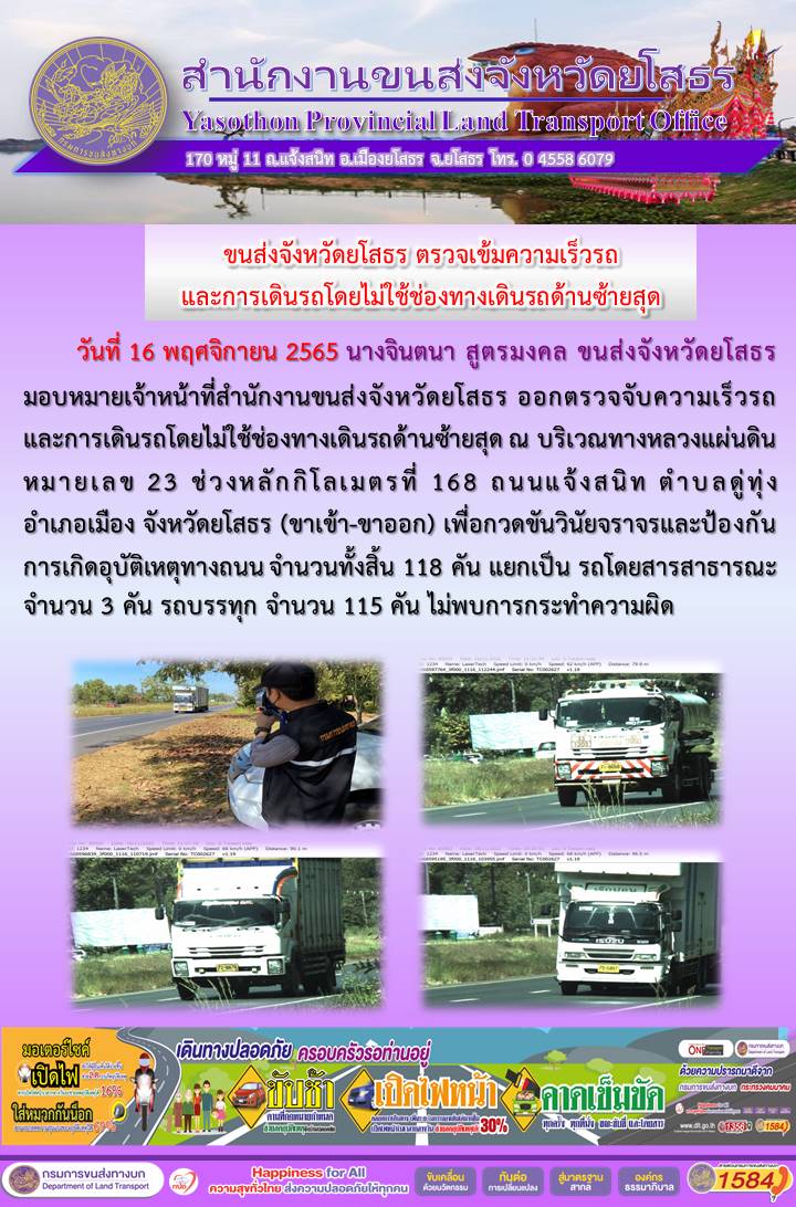 วันที่ 16 พฤศจิกายน 2565 เจ้าหน้าที่สำนักงานขนส่งจังหวัดยโสธร ออกตั้งจุดตรวจจับความเร็ว