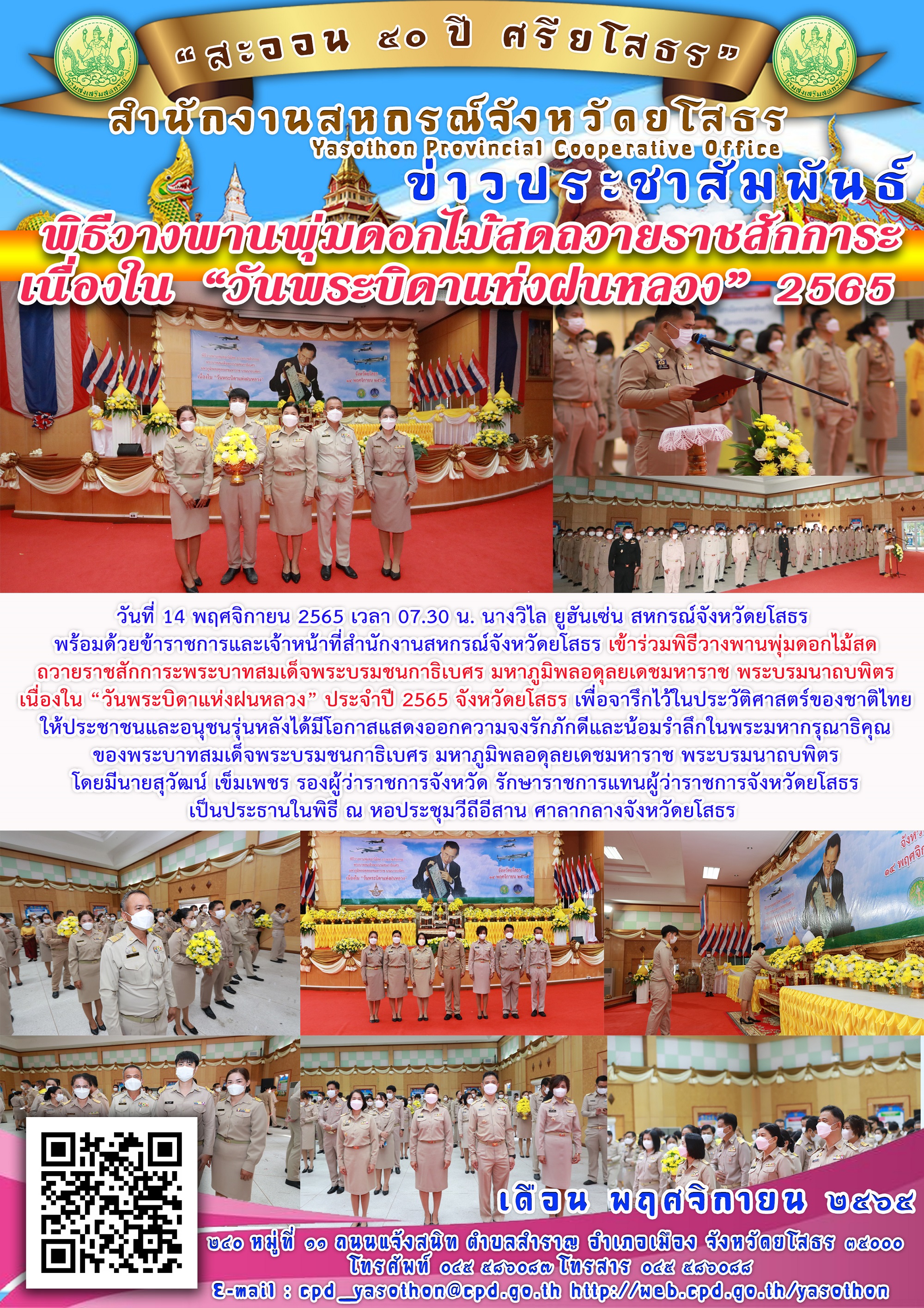 นางวิไล ยูฮันเซ่น สหกรณ์จังหวัดยโสธร พร้อมด้วยข้าราชการและเจ้าหน้าที่สำนักงานสหกรณ์จังหวัดยโสธร เข้าร่วมพิธีวางพานพุ่มดอกไม้สดถวายราชสักการะพระบาทสมเด็จพระบรมชนกาธิเบศร มหาภูมิพลอดุลยเดชมหาราช พระบรมนาถบพิตร
