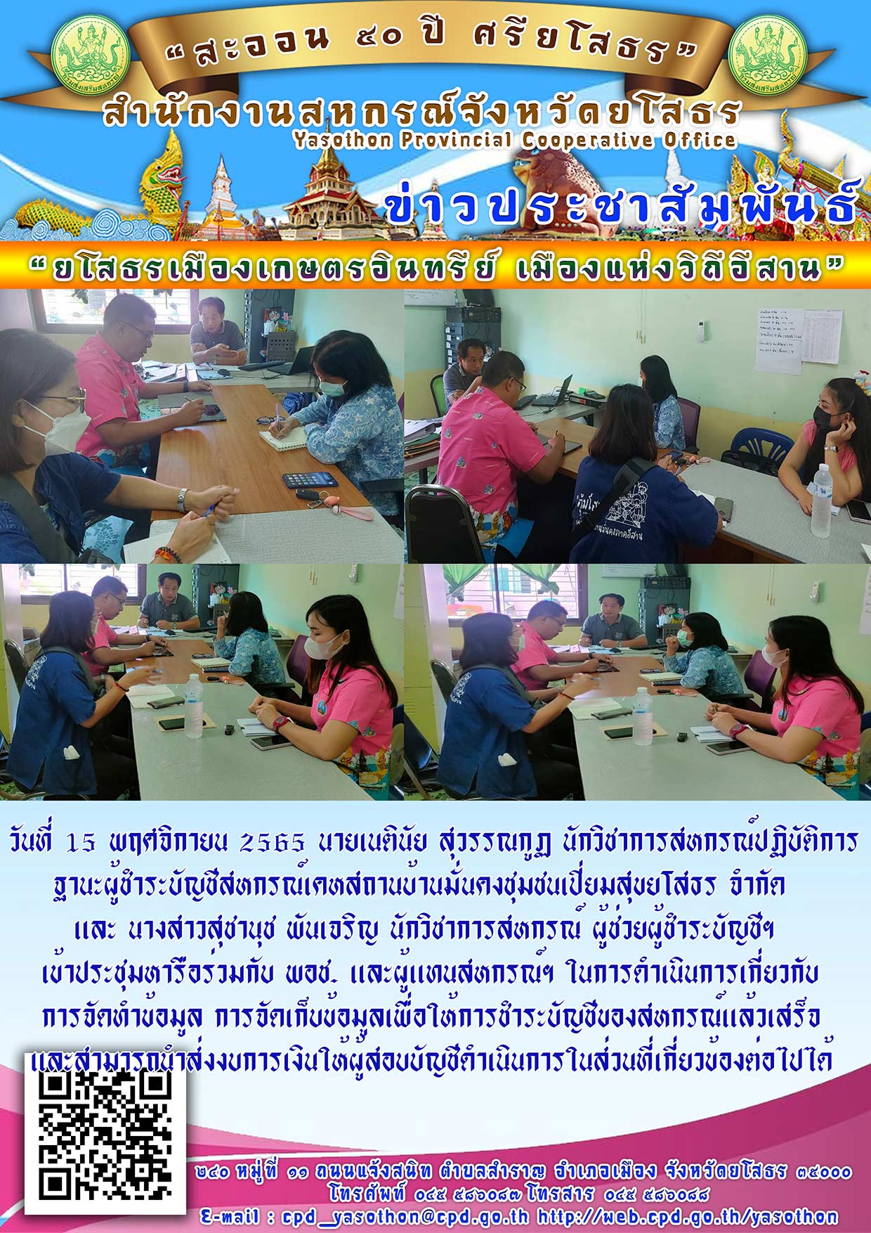เจ้าหน้าที่สำนักงานสหกรณ์จังหวัดยโสธร เข้าประชุมหารือร่วมกับ พอช. และผู้แทนจากสหกรณ์ฯ ในการดำเนินการเกี่ยวกับการจัดทำข้อมูล การจัดเก็บข้อมูลเพื่อให้การชำระบัญชีของสหกรณ์ แล้วเสร็จ และสามารถนำส่งงบการเงินให้ผู้สอบบัญชีดำเนินการในส่วนที่เกี่ยวข้องต่อไป