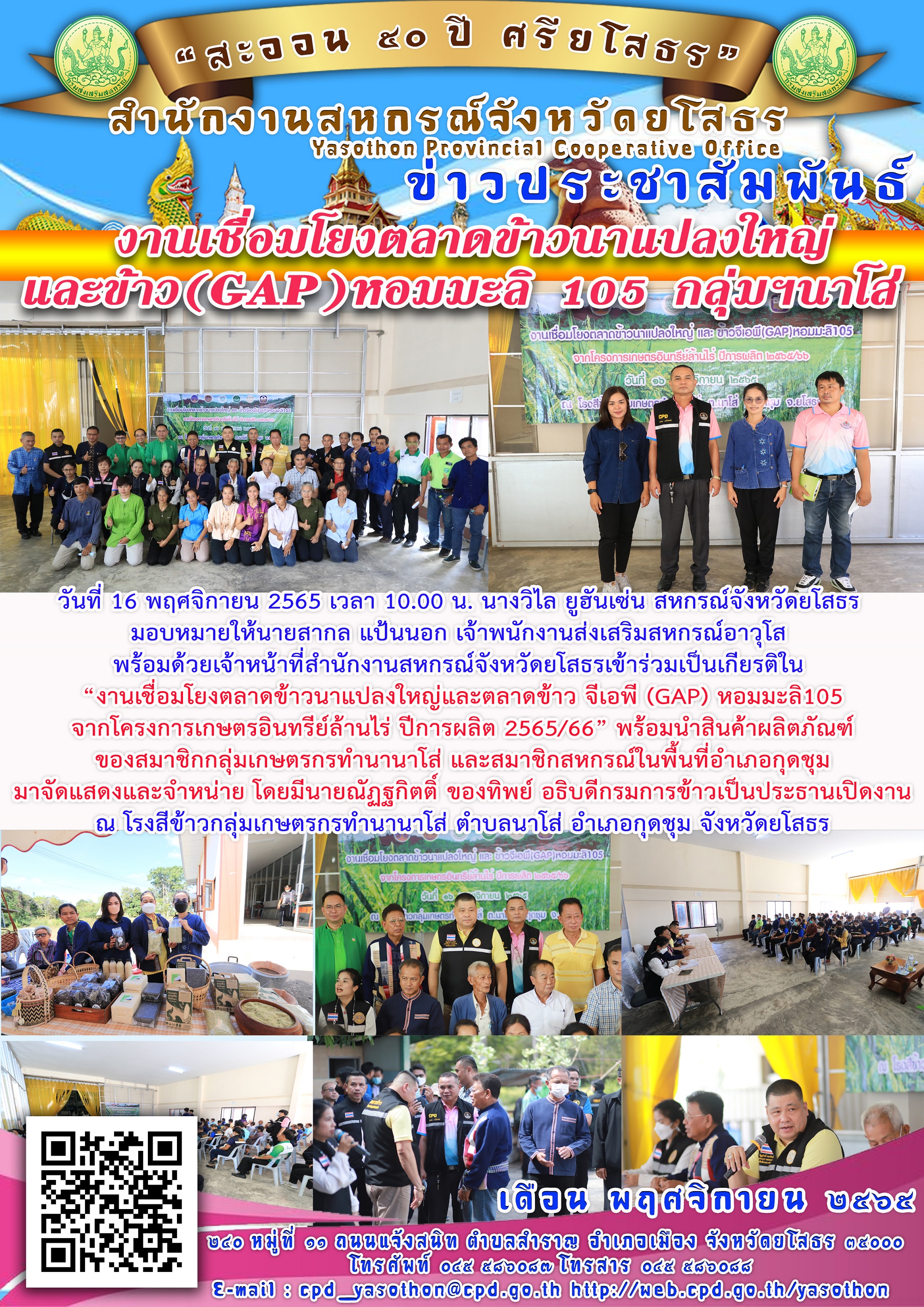 เจ้าหน้าที่สำนักงานสหกรณ์จังหวัดยโสธร เข้าร่วมงานเชื่อมโยงตลาดข้าวนาแปลงใหญ่และตลาดข้าวจีเอพี (GAP) หอมมะลิ 105 ณ โรงสีข้าวกลุ่มเกษตรกรทำนานาโส่