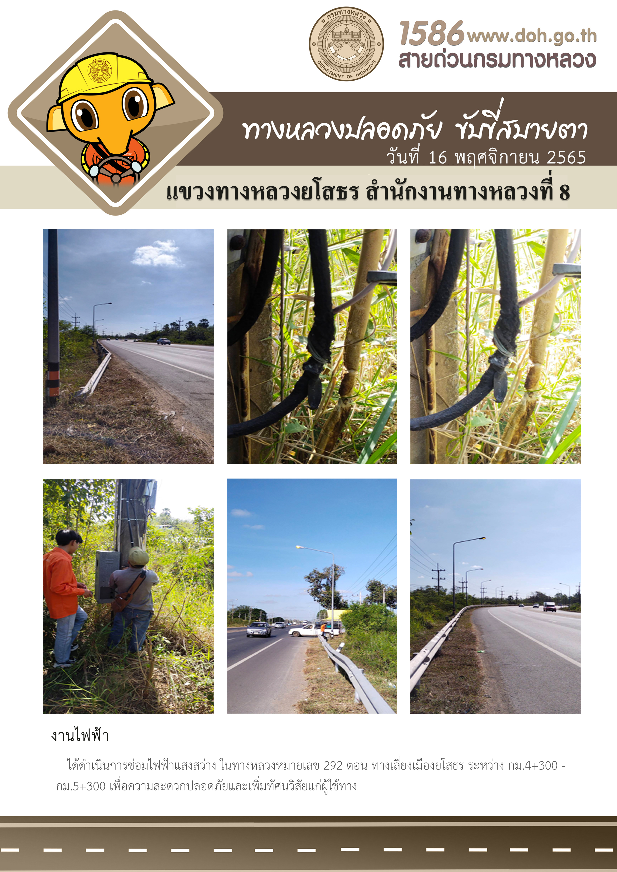 วันที่ 16 พฤศจิกายน 2565 งานไฟฟ้า ได้ดำเนินการซ่อมไฟฟ้าแสงสว่าง ในทางหลวงหมายเลข 292 ตอน ทางเลี่ยงเมืองยโสธร ระหว่าง กม.4+300 - กม.5+300 เพื่อความสะดวกปลอดภัยและเพิ่มทัศนวิสัยแก่ผู้ใช้ทาง