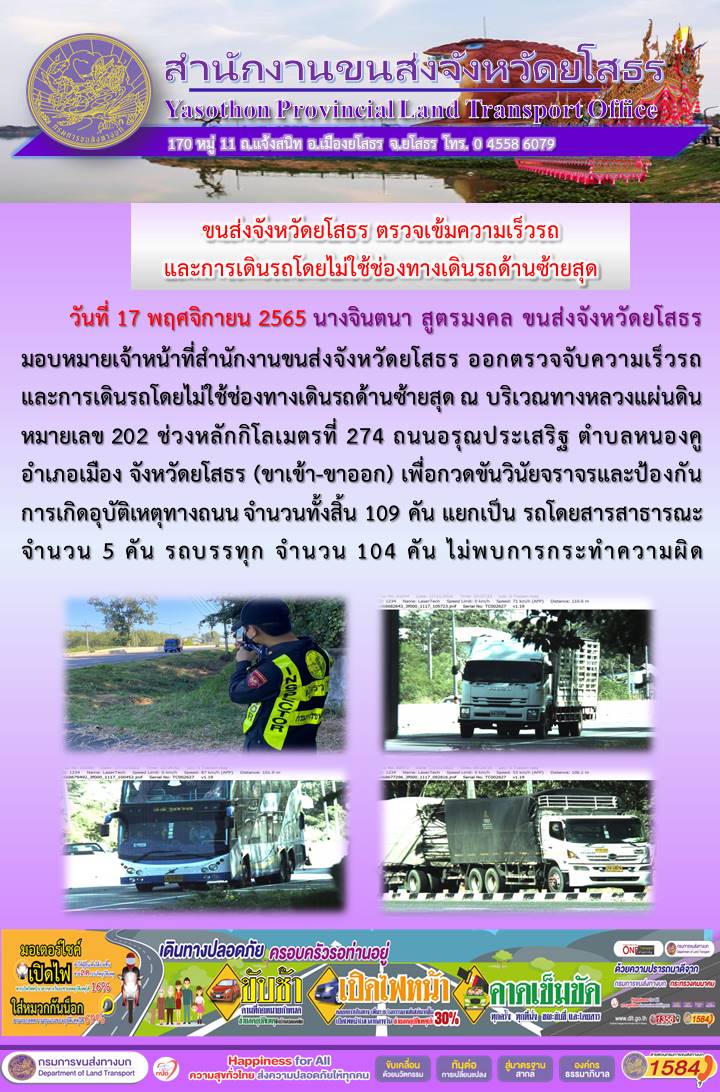 วันที่ 17 พฤศจิกายน 2565 เจ้าหน้าที่สำนักงานขนส่งจังหวัดยโสธร ออกตั้งจุดตรวจจับความเร็ว