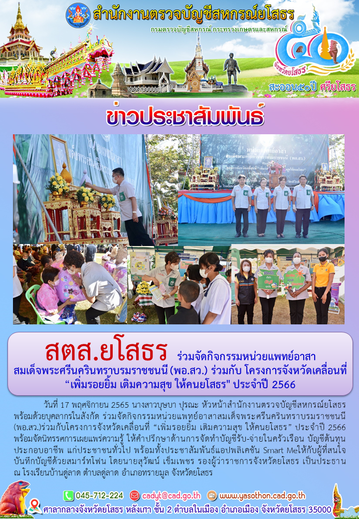 สตส.ยโสธร ร่วมจัดกิจกรรมหน่วยแพทย์อาสาสมเด็จพระศรีนครินทราบรมราชชนนี (พอ.สว.) ร่วมกับ โครงการจังหวัดเคลื่อนที่ “เพิ่มรอยยิ้ม เติมความสุข ให้คนยโสธร" ประจำปี 2566