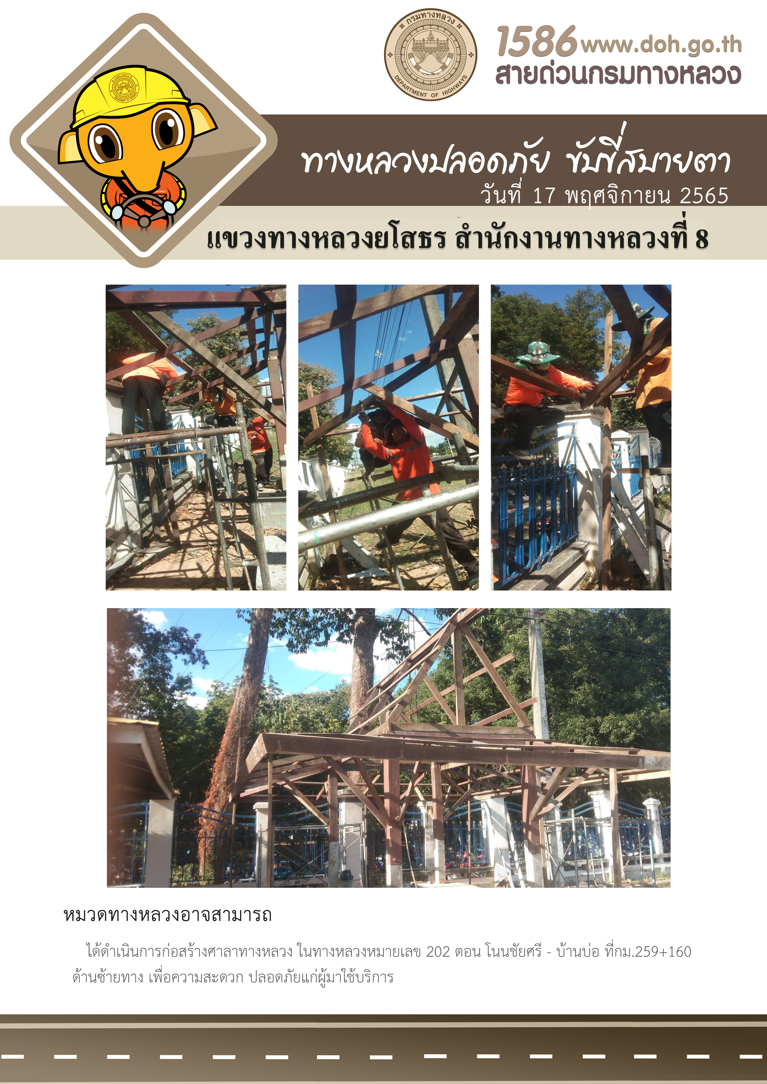 วันที่ 17 พฤศจิกายน 2565 หมวดทางหลวงอาจสามารถ ได้ดำเนินการก่อสร้างศาลาทางหลวง ในทางหลวงหมายเลข 202 ตอน โนนชัยศรี - บ้านบ่อ ที่กม. 259+160 ด้านซ้ายทาง เพื่อความสะดวก ปลอดภัยแก่ผู้มาใช้บริการ