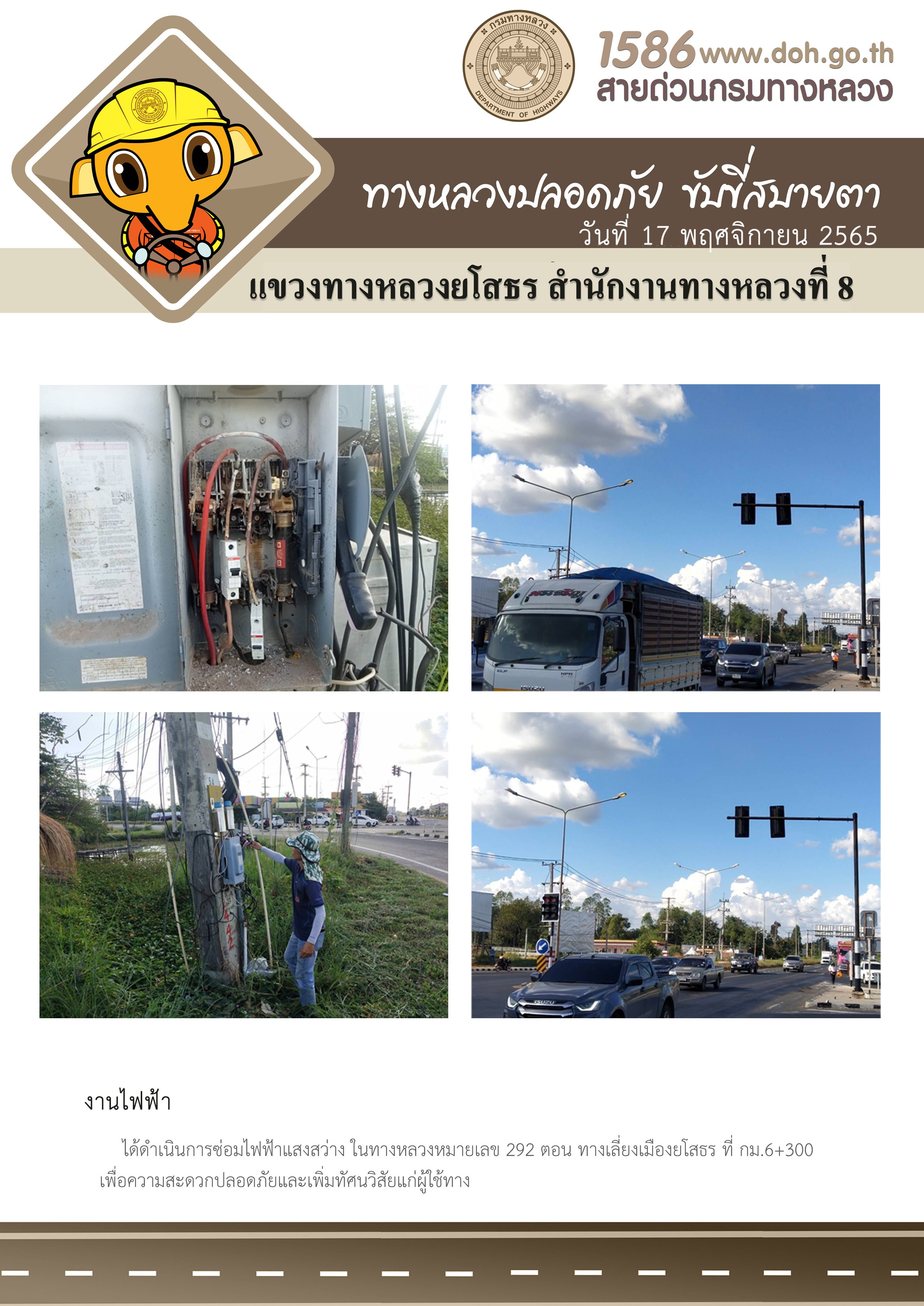 วันที่ 17 พฤศจิกายน 2565 งานไฟฟ้า ได้ดำเนินการซ่อมไฟฟ้าแสงสว่าง ในทางหลวงหมายเลข 292 ตอน ทางเลี่ยงเมืองยโสธร ที่ กม.6+300 เพื่อความสะดวกปลอดภัยและเพิ่มทัศนวิสัยแก่ผู้ใช้ทาง