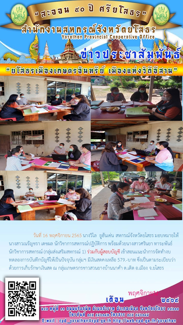 เจ้าหน้าที่สำนักงานสหกรณ์จังหวัดยโสธร ร่วมกับผู้สอบบัญชี เข้าสอนแนะนำการจัดทำงบทดลองการบันทึกบัญชีให้เป็นปัจจุบัน ณ กลุ่มเกษตรกรชาวสวนยางบ้านนาคำ ตำบลเดิด