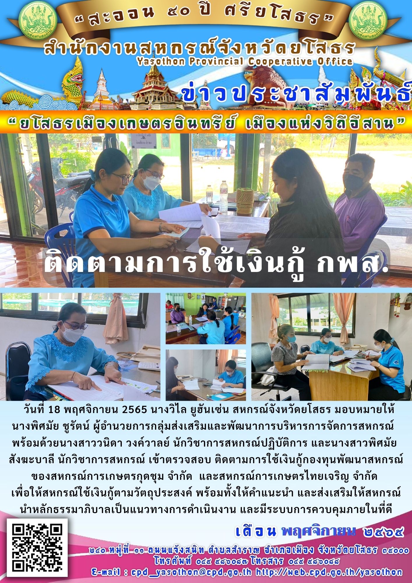เจ้าหน้าที่สำนักงานสหกรณ์จังหวัดยโสธร เข้าตรวจสอบ ติดตามการใช้เงินกู้กองทุนพัฒนาสหกรณ์ ของสหกรณ์การเกษตรกุดชุม จำกัด และสหกรณ์การเกษตรไทยเจริญ จำกัด เพื่อให้สหกรณ์ใช้เงินกู้ตามวัตถุประสงค์ พร้อมทั้งให้คำแนะนำ ส่งเสริมให้สหกรณ์ใช้หลักธรรมาภิบาล