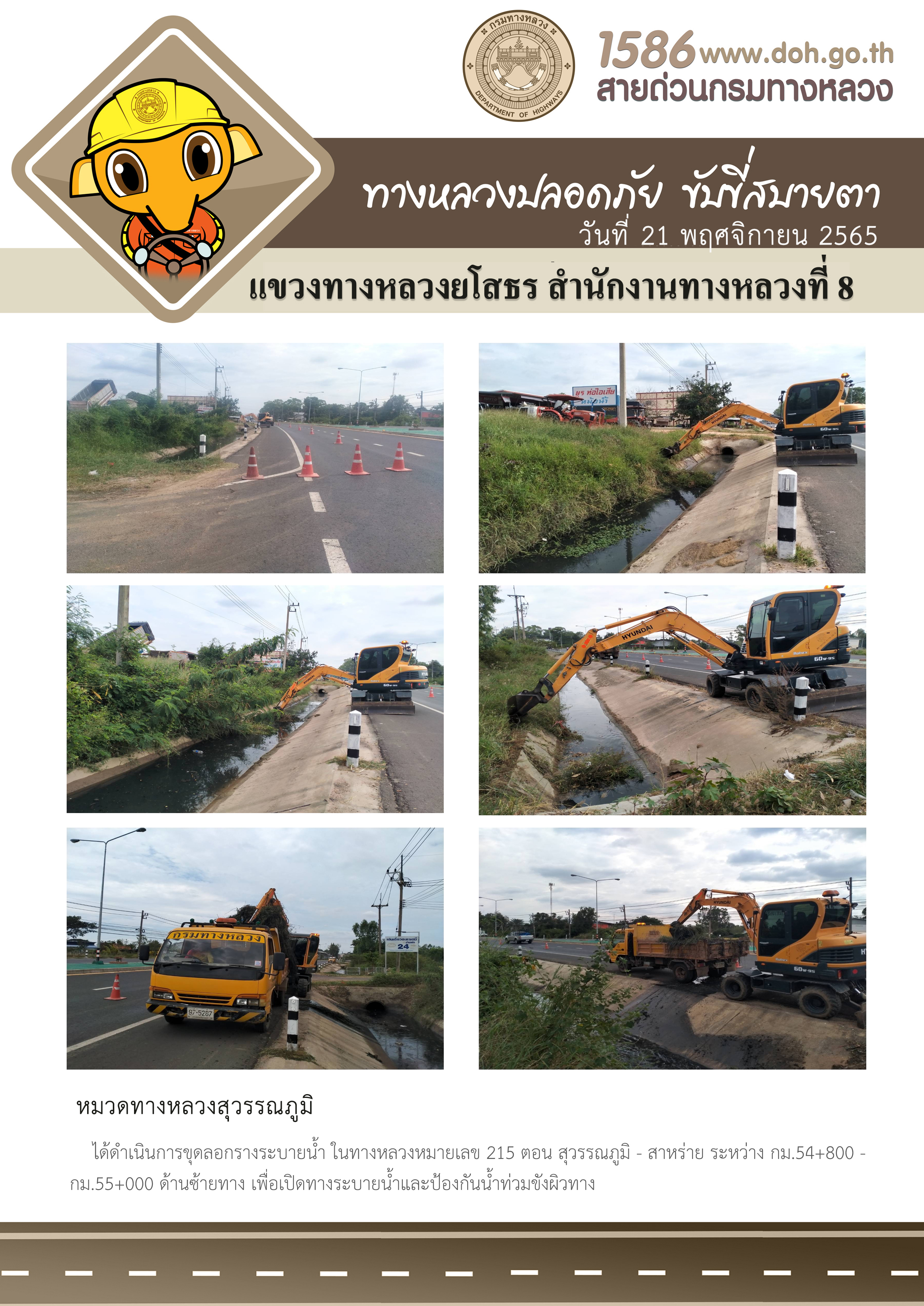 วันที่ 21 พฤศจิกายน 2565 หมวดทางหลวงสุวรรณภูมิ ได้ดำเนินการขุดลอกรางระบายน้ำ ในทางหลวงหมายเลข 215 ตอน สุวรรณภูมิ - สาหร่าย ระหว่าง กม.54+800 - กม.55+000 ด้านซ้ายทาง เพื่อเปิดทางระบายน้ำและป้องกันน้ำท่วมขังผิวทาง