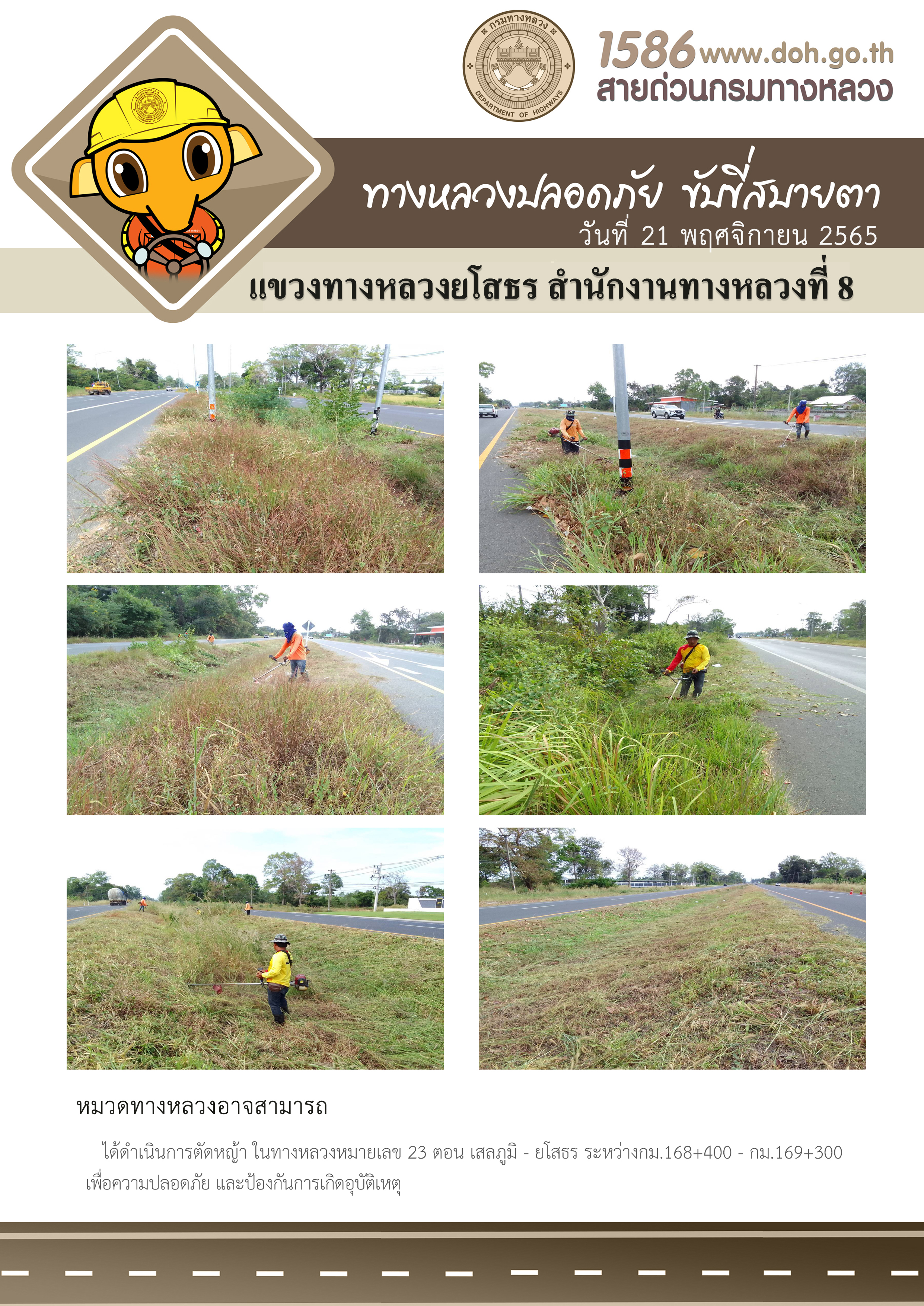 วันที่ 21 พฤศจิกายน 2565 หมวดทางหลวงอาจสามารถ ได้ดำเนินการตัดหญ้า ในทางหลวงหมายเลข 23 ตอน เสลภูมิ - ยโสธร ระหว่างกม.168+400 - กม.169+300 เพื่อความปลอดภัย และป้องกันการเกิดอุบัติเหตุ
