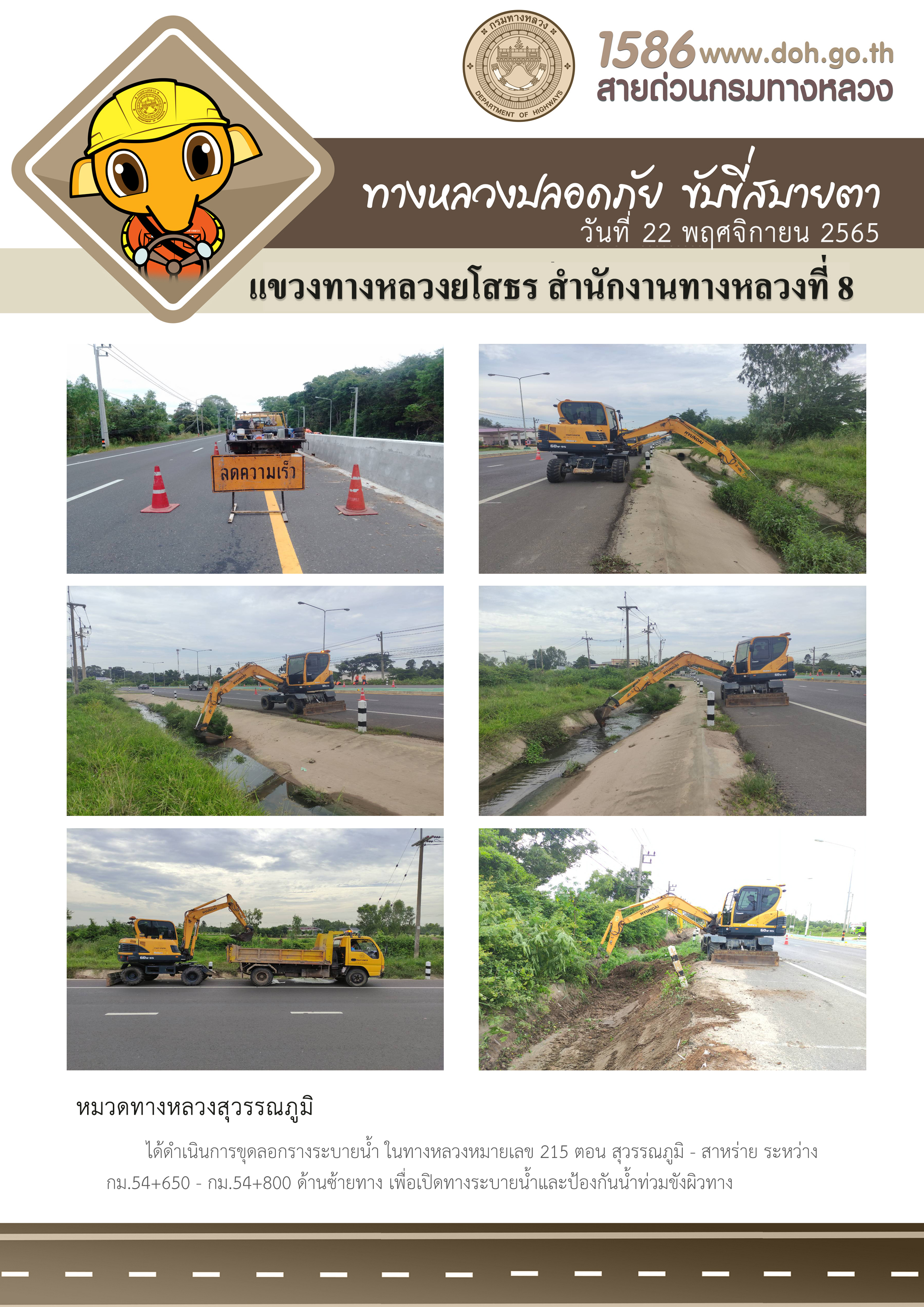 วันที่ 22 พฤศจิกายน 2565 หมวดทางหลวงสุวรรณภูมิ ได้ดำเนินการขุดลอกรางระบายน้ำ ในทางหลวงหมายเลข 215 ตอน สุวรรณภูมิ - สาหร่าย ระหว่าง กม.54+650 - กม.54-800 ด้านซ้ายทาง เพื่อเปิดทางระบายน้ำและป้องกันน้ำท่วมขังผิวทาง