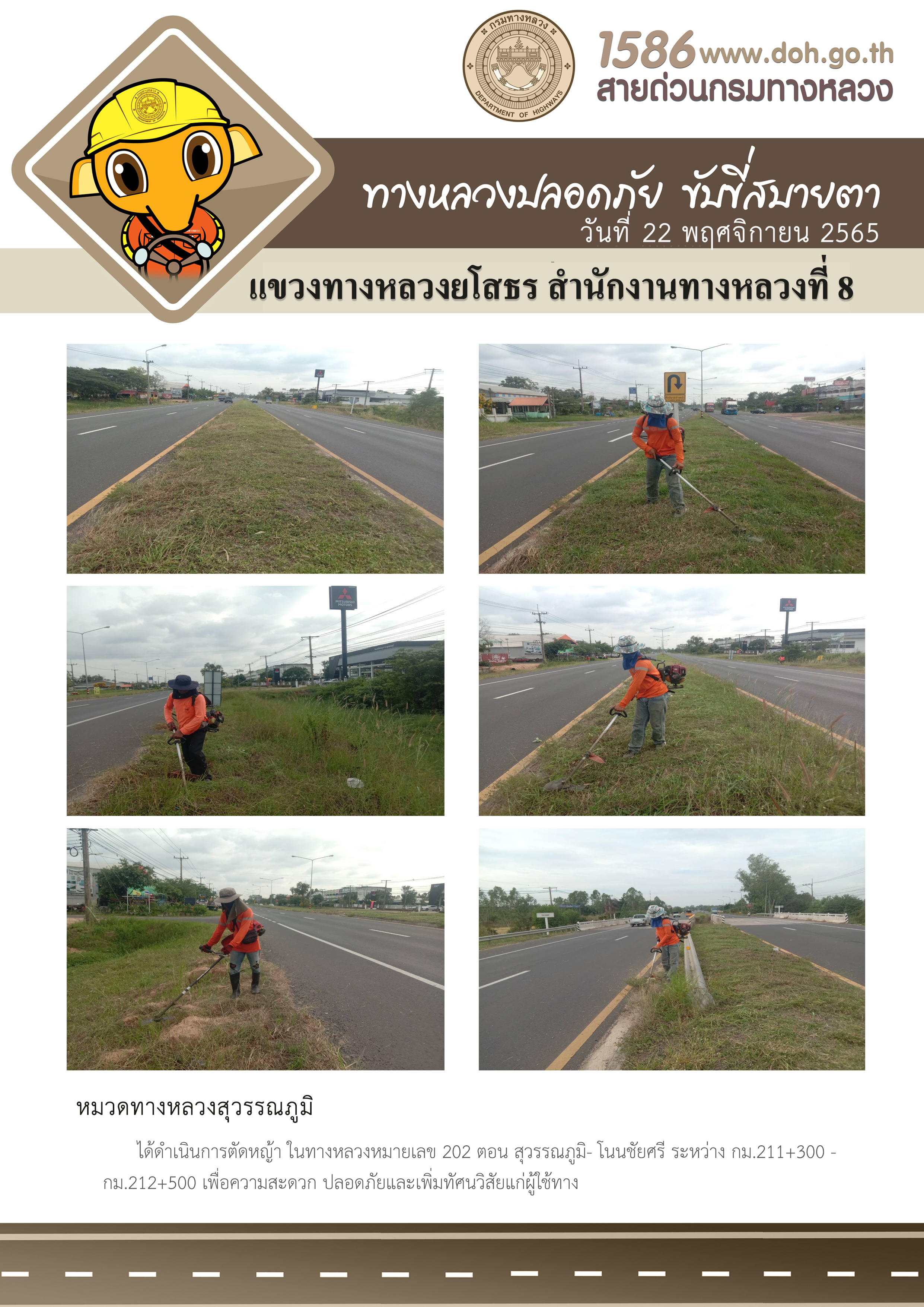 วันที่ 22 พฤศจิกายน 2565 หมวดทางหลวงสุวรรณภูมิ ได้ดำเนินการตัดหญ้า ในทางหลวงหมายเลข 202 ตอน สุวรรณภูมิ- โนนชัยศรี ระหว่าง กม.211+300 - กม.212+500 เพื่อความสะดวก ปลอดภัยและเพิ่มทัศนวิสัยแก่ผู้ใช้ทาง