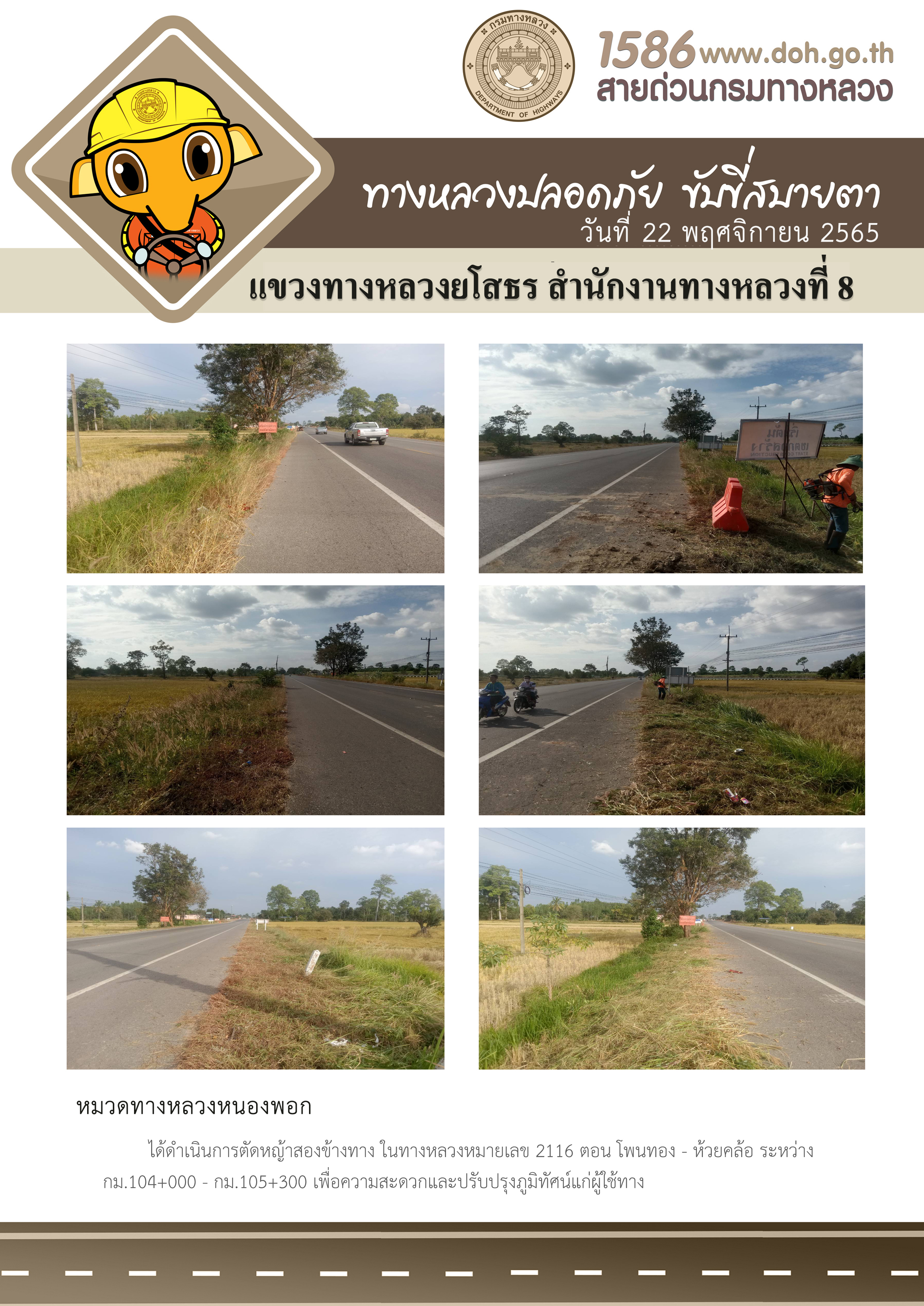 วันที่ 22 พฤศจิกายน 2565 หมวดทางหลวงหนองพอก ได้ดำเนินการตัดหญ้าสองข้างทาง ในทางหลวงหมายเลข 2116 ตอน โพนทอง - ห้วยคล้อ ระหว่าง กม.104+000 - กม.105+300 เพื่อความสะดวกและปรับปรุงภูมิทัศน์แก่ผู้ใช้ทาง