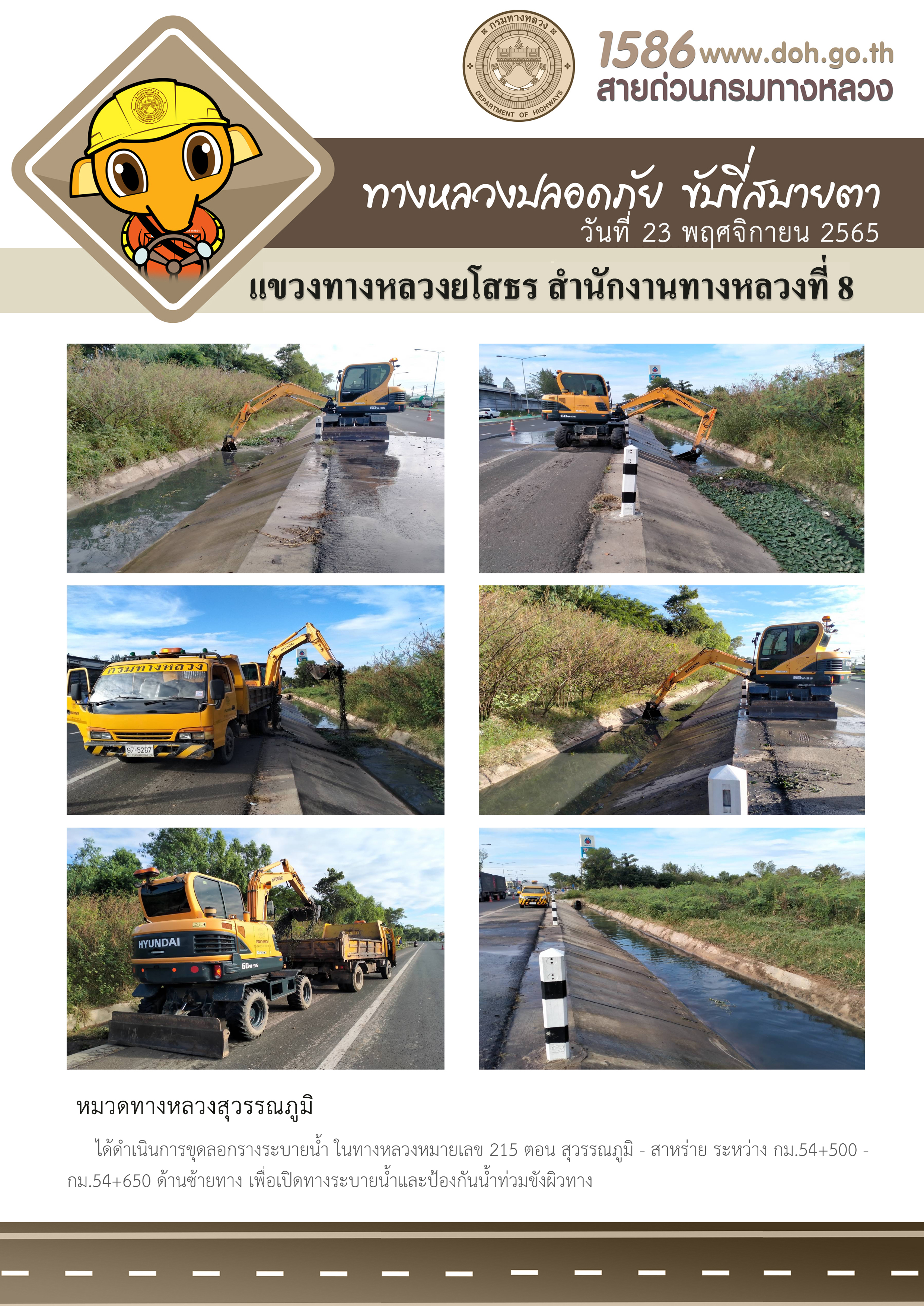 วันที่ 23 พฤศจิกายน 2565 หมวดทางหลวงสุวรรณภูมิ ได้ดำเนินการขุดลอกรางระบายน้ำ ในทางหลวงหมายเลข 215 ตอน สุวรรณภูมิ - สาหร่าย ระหว่าง กม.54+500 - กม.54+650 ด้านซ้ายทาง เพื่อเปิดทางระบายน้ำและป้องกันน้ำท่วมขังผิวทาง