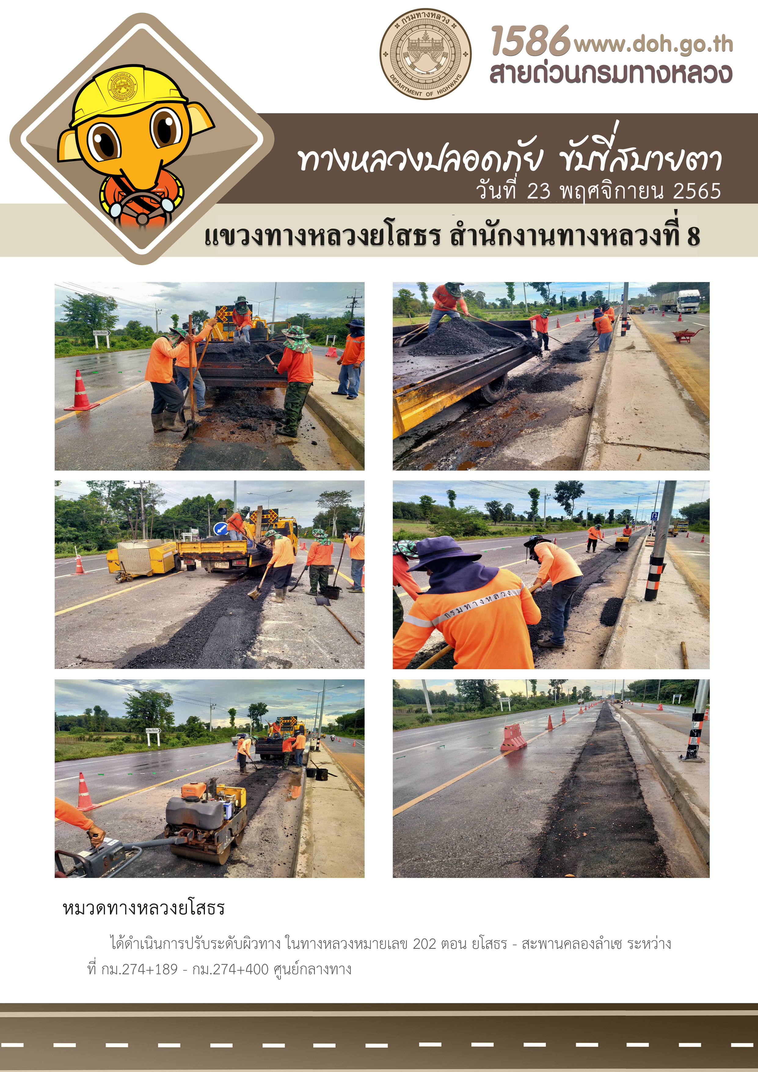 วันที่ 23 พฤศจิกายน 2565 หมวดทางหลวงยโสธร ได้ดำเนินการปรับระดับผิวทาง ในทางหลวงหมายเลข 202 ตอน ยโสธร - สะพานคลองลำเซ ระหว่าง ที่ กม.274+189 - กม.274+400 ศูนย์กลางทาง