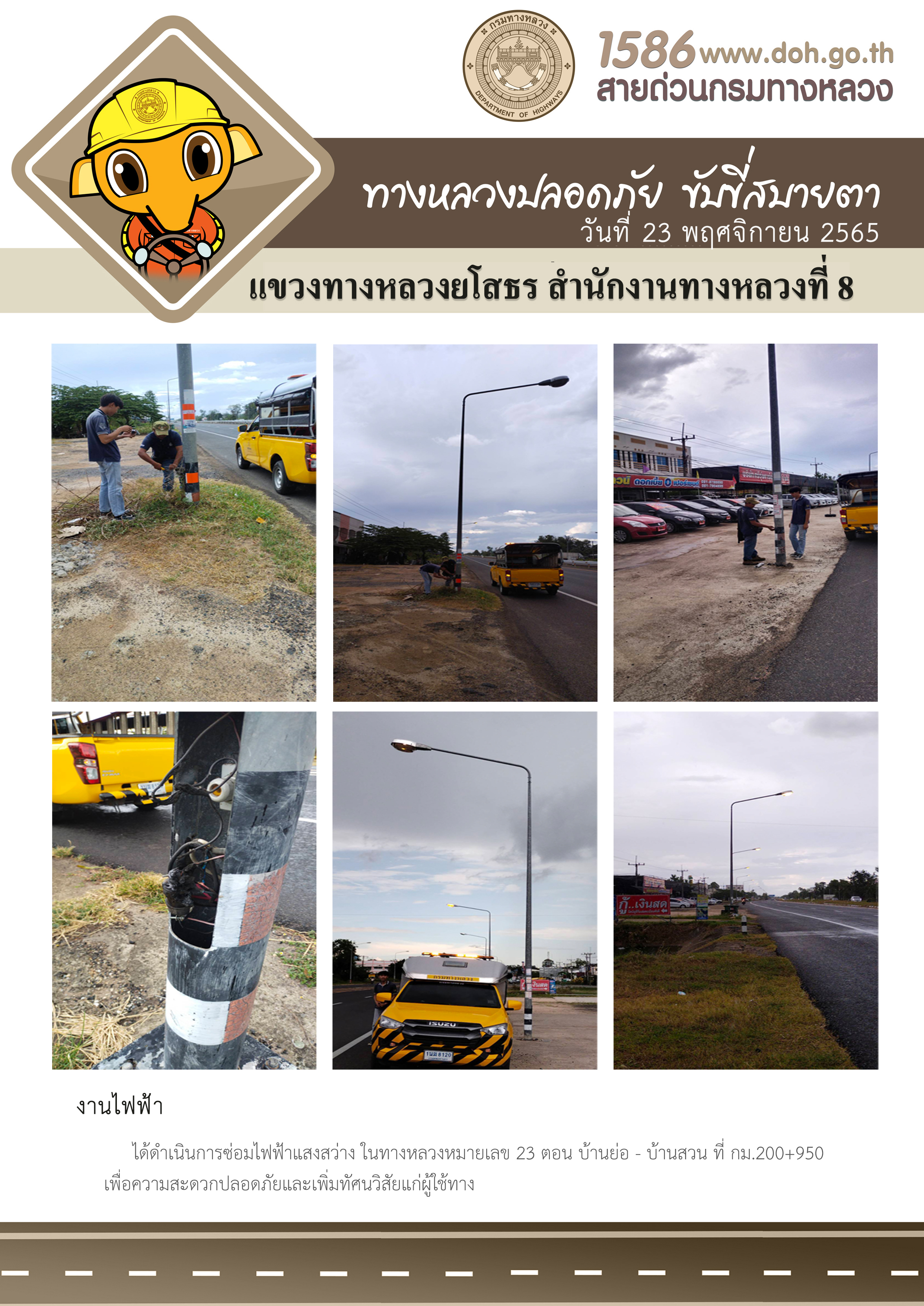 วันที่ 23 พฤศจิกายน 2565 งานไฟฟ้า ได้ดำเนินการซ่อมไฟฟ้าแสงสว่าง ในทางหลวงหมายเลข 23 ตอน บ้านย่อ - บ้านสวน ที่ กม.200+950 เพื่อความสะดวกปลอดภัยและเพิ่มทัศนวิสัยแก่ผู้ใช้ทาง