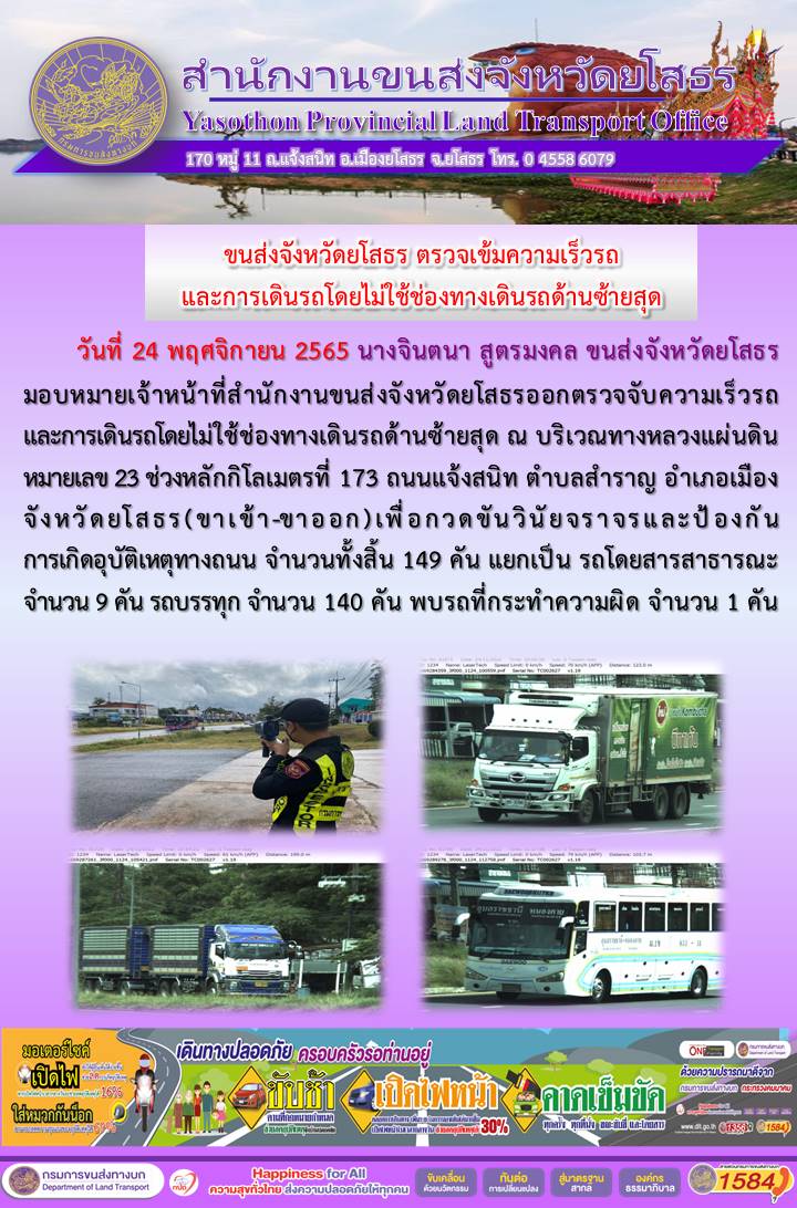 วันที่ 24 พฤศจิกายน 2565 เจ้าหน้าที่สำนักงานขนส่งจังหวัดยโสธร ออกตั้งจุดตรวจจับความเร็ว