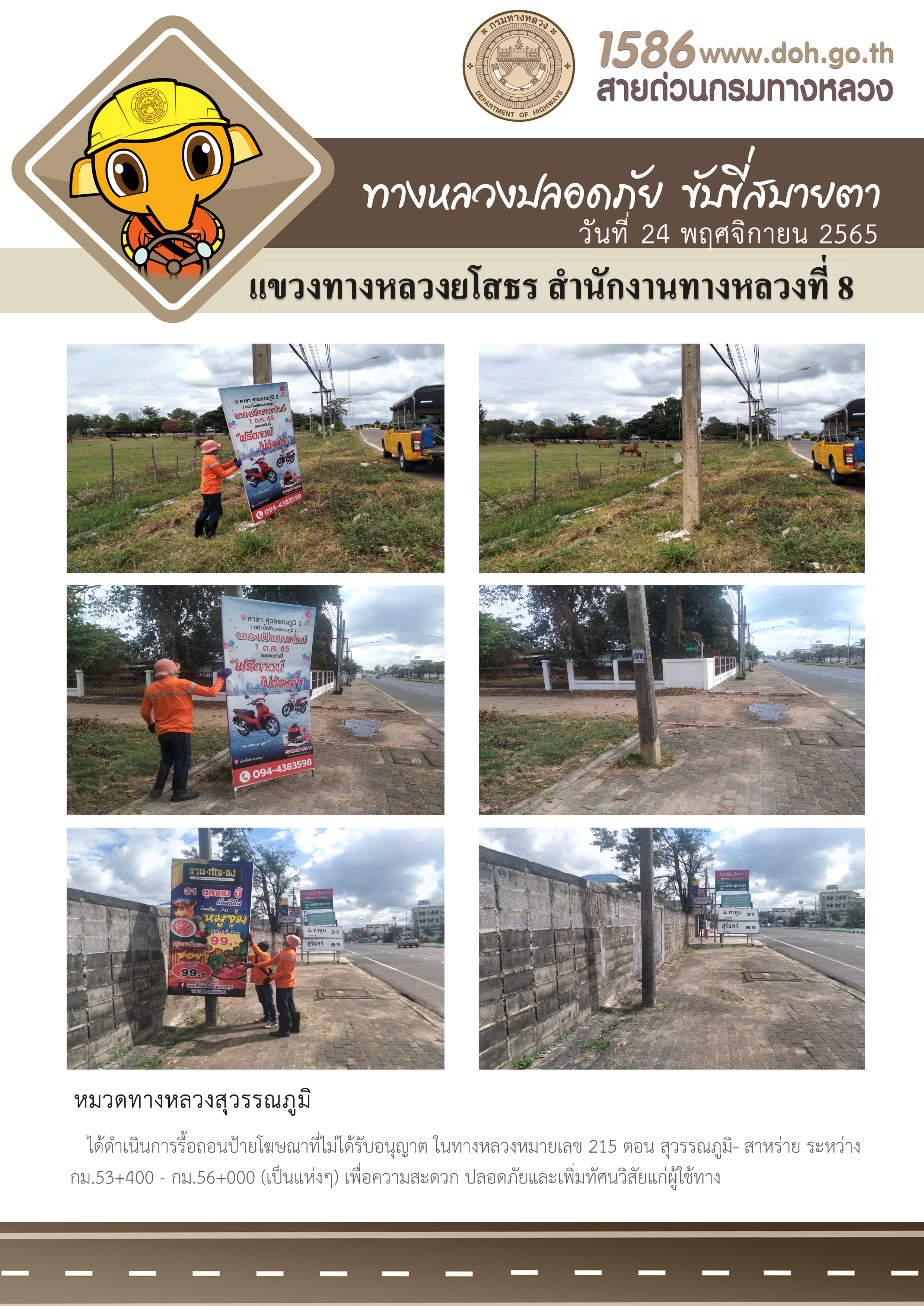 วันที่ 24 พฤศจิกายน 2565 หมวดทางหลวงสุวรรณภูมิ ได้ดำเนินการรื้อถอนป้ายโฆษณาที่ไม่ได้รับอนุญาต ในทางหลวงหมายเลข 215 ตอน สุวรรณภูมิ-สาหร่าย ระหว่าง กม.53+400 - กม.56+000 (เป็นแห่งๆ) เพื่อความสะดวกปลอดภัยและเพิ่มทัศนวิสัยแก่ผู้ใช้ทาง