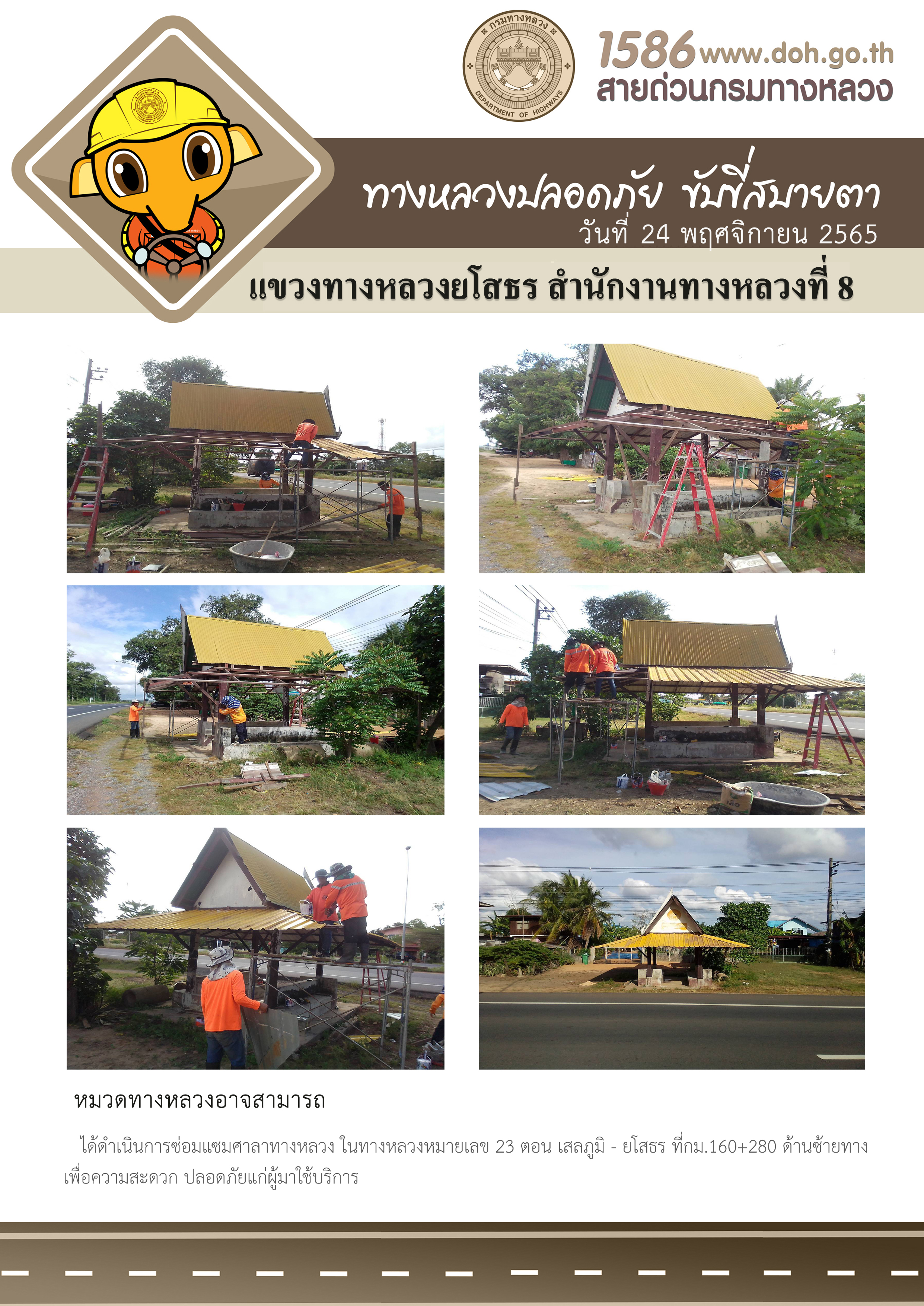 วันที่ 24 พฤศจิกายน 2565 หมวดทางหลวงอาจสามารถ ได้ดำเนินการซ่อมแซมศาลาทางหลวง ในทางหลวงหมายเลข 23 ตอน เสลภูมิ - ยโสธร ที่กม.160+280 ด้านซ้ายทาง เพื่อความสะดวกปลอดภัยแก่ผู้มาใช้บริการ
